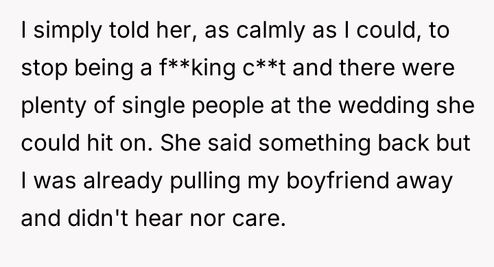 While the OP’s protective instinct was understandable given the aggressive nature of Sally's advances, using extreme profanity in a public setting like a wedding reception, even when provoked, escalates the situation unnecessarily. A more constructive approach, after firmly removing the boyfriend, would have been to address the BIL privately, confirming the sister's support for the OP's reaction, and firmly stating that boundary violations against the OP's partner will not be tolerated, irrespective of Sally's 'personality.'