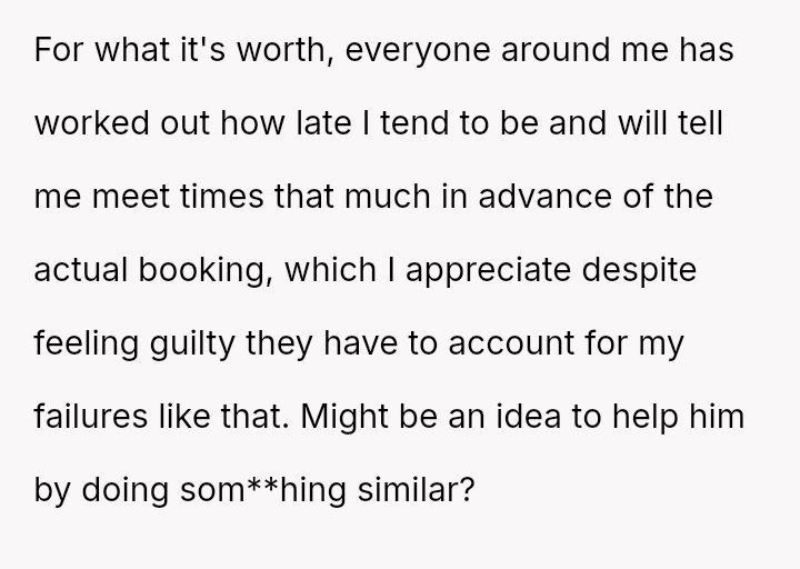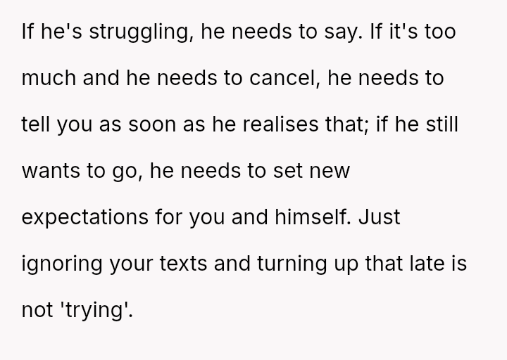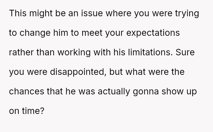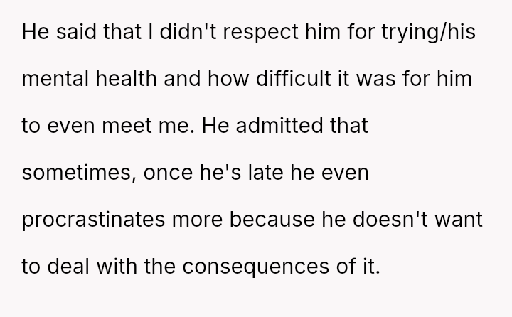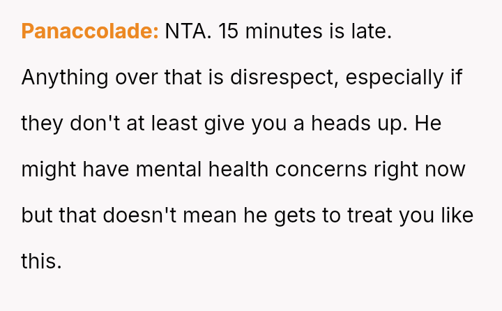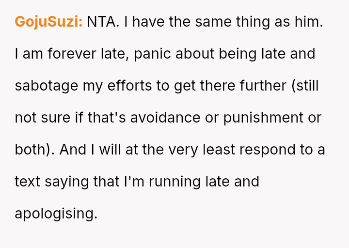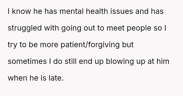 The core question is whether the OP is justified in demanding punctuality and timely communication about delays, or if the partner's efforts to manage his mental health and social anxiety necessitate a greater degree of flexibility and forgiveness from the OP regarding scheduling mishaps.