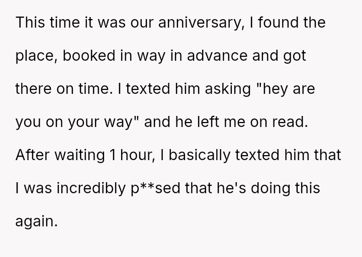 The original poster (OP) feels disrespected and frustrated because her partner consistently shows a lack of consideration for her time, especially during important occasions like their anniversary, despite her efforts to be patient due to his acknowledged mental health struggles.