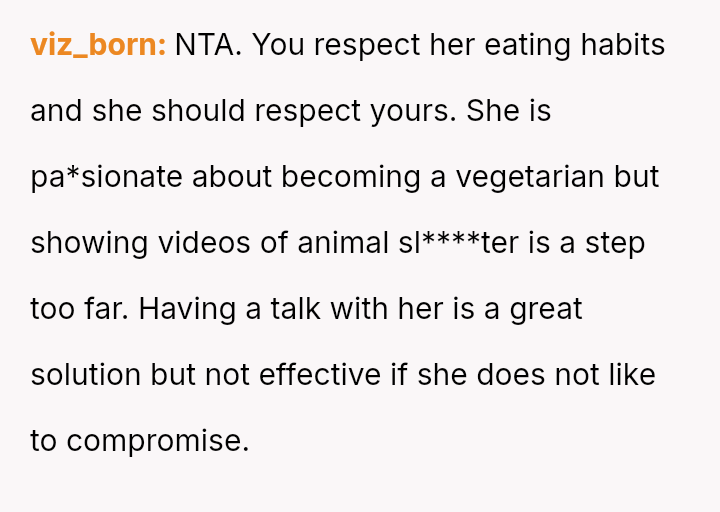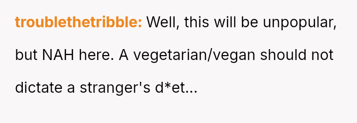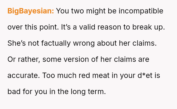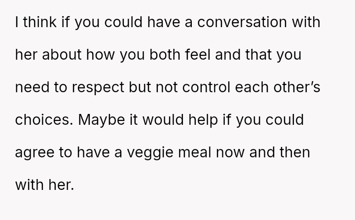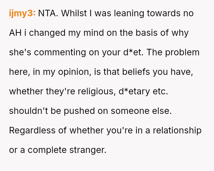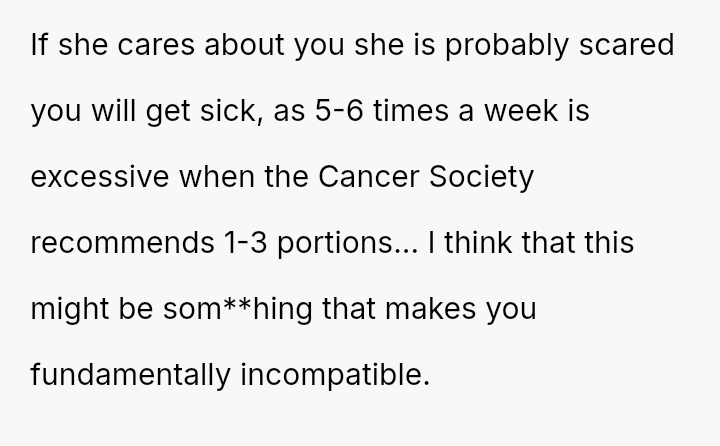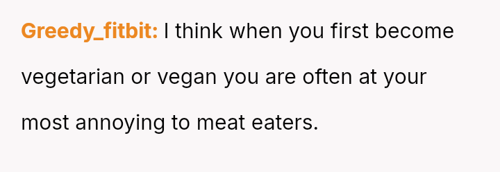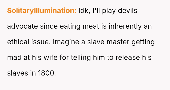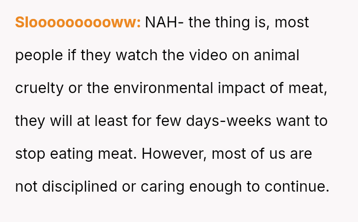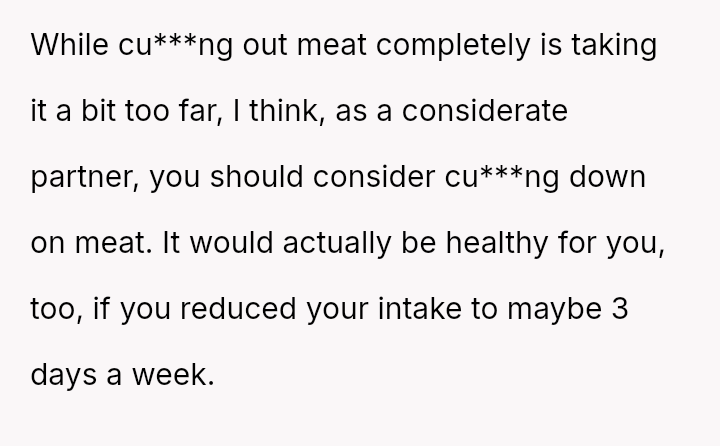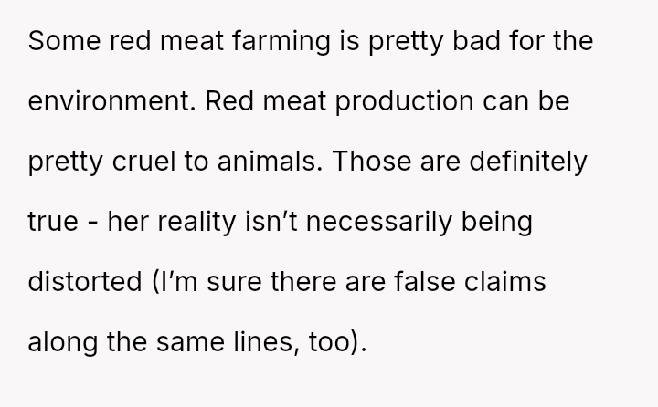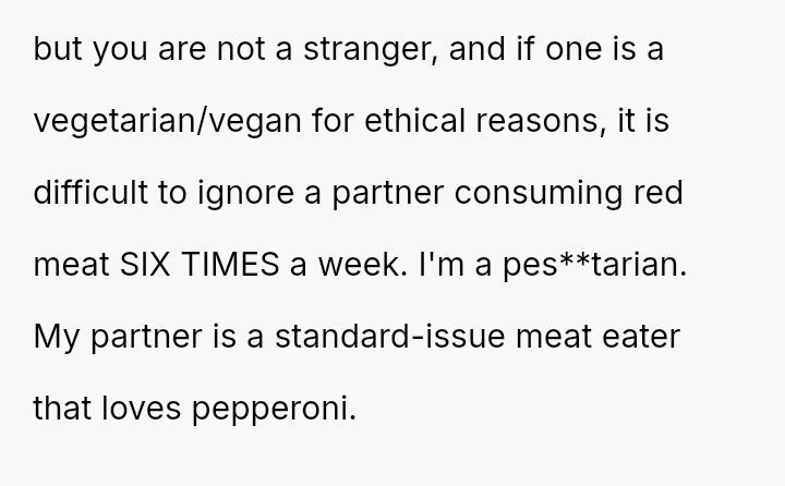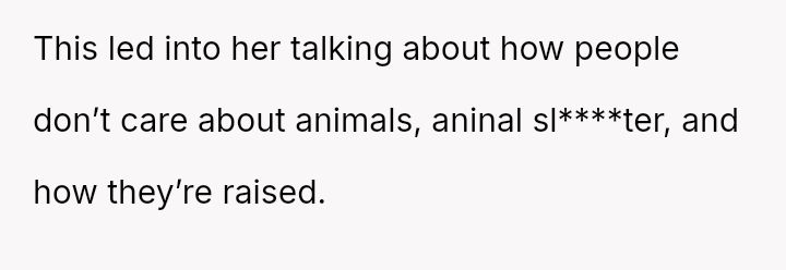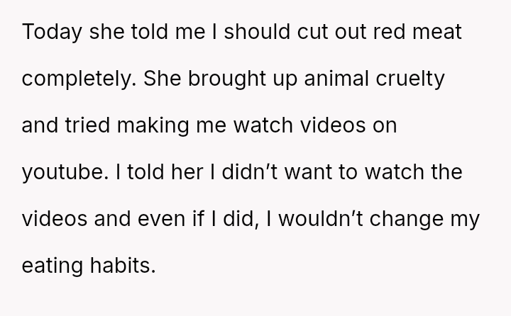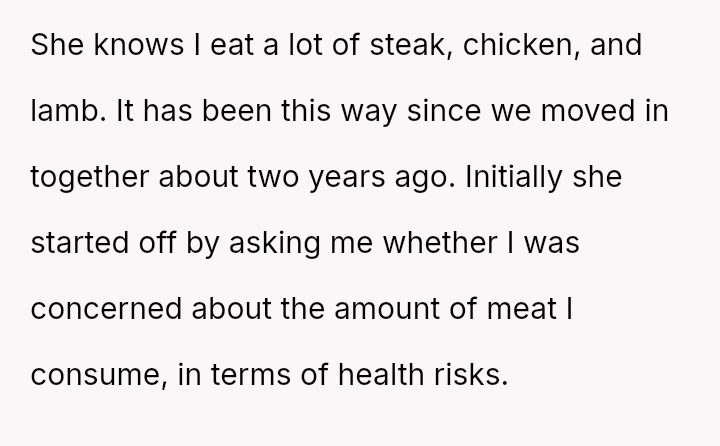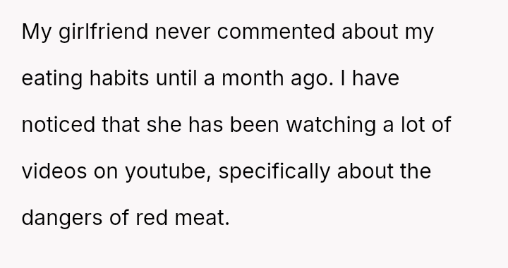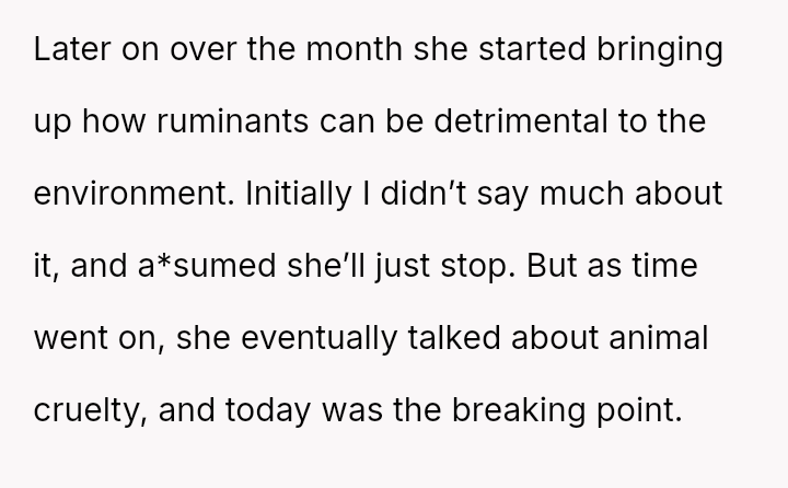 What started as casual curiosity soon morphed into quiet tension, as her concern over his meat consumption turned into pa*sionate pleas about health, the environment, and animal cruelty.