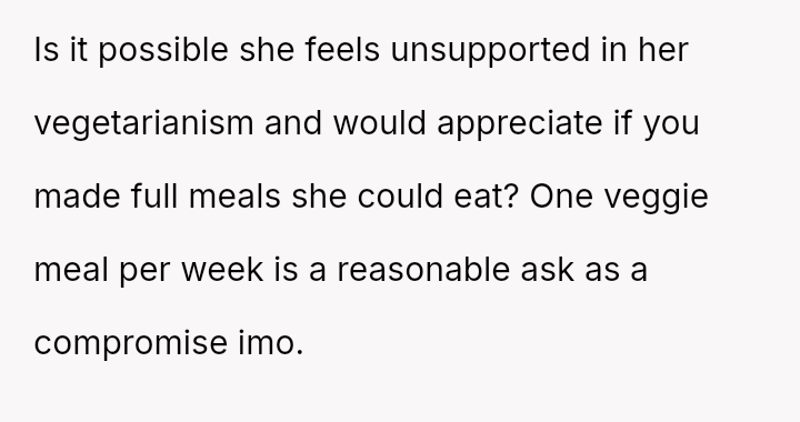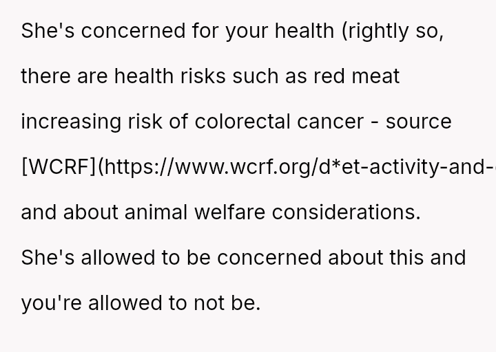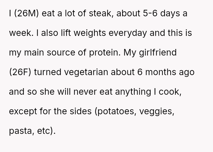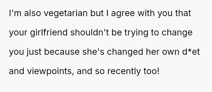 The original poster feels frustrated because his girlfriend is trying to impose her new vegetarian beliefs onto his long-standing d*etary habits, leading to conflict despite his efforts not to interfere with her choices.
