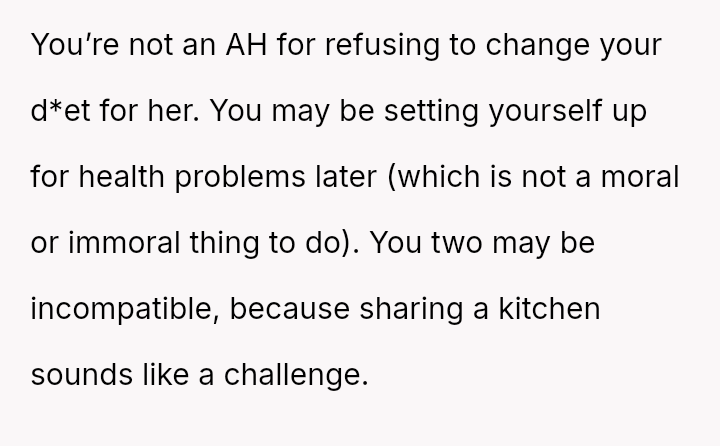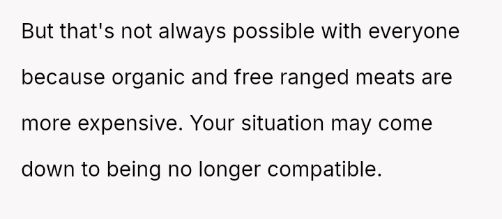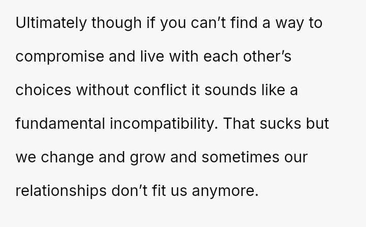Is it acceptable for a partner to pressure the other to drastically change fundamental lifestyle habits, such as d*et, based on their own moral or ethical shifts, or must each partner maintain complete autonomy over their personal choices within the relationship?