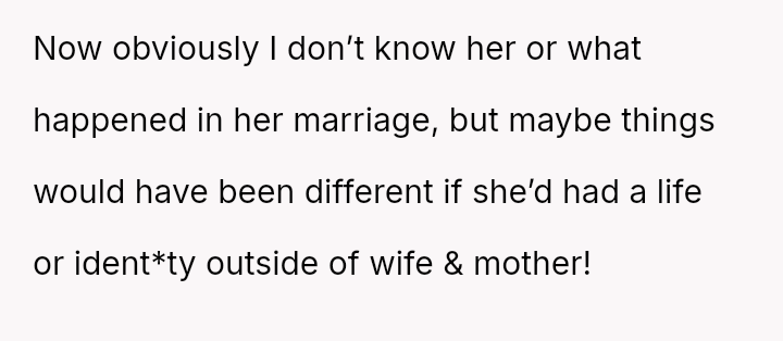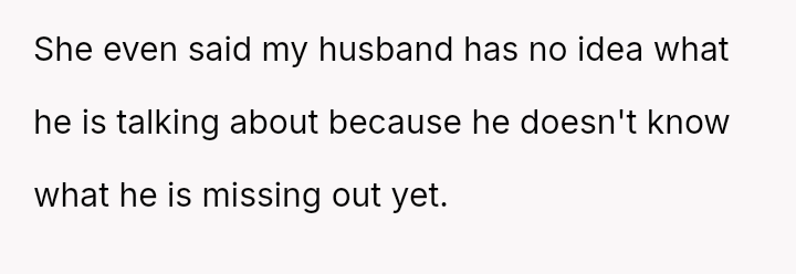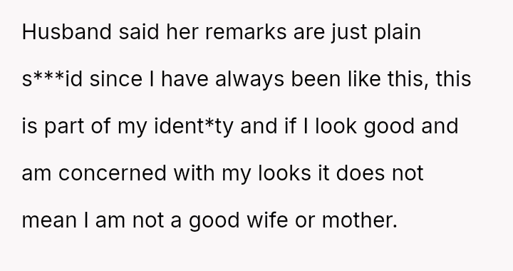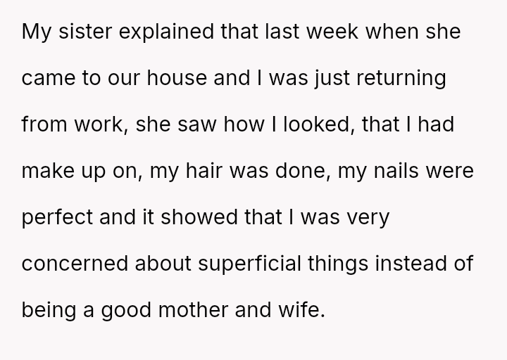 During a recent visit to her parents' home, the narrator's sister began criticizing her marriage and parenting choices, suggesting that the narrator's concern for her appearance (makeup, hair, nails) meant she was not providing the 'proper care and attention' required of a mother and wife.