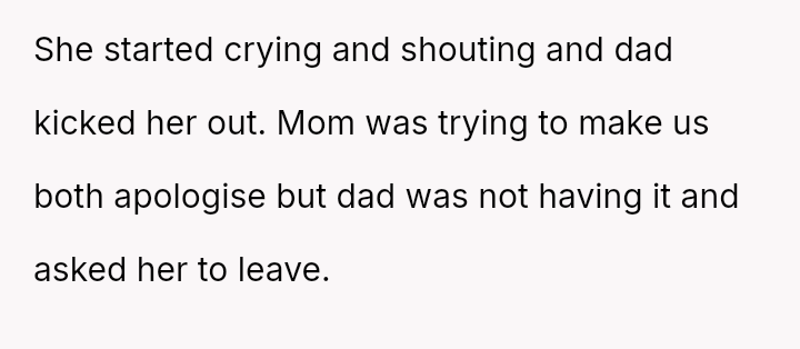 When the narrator became angry at the public criticism, she retorted by bringing up the sister's divorce, leading to a major argument where the sister was ultimately asked to leave by their father.