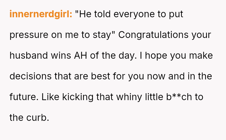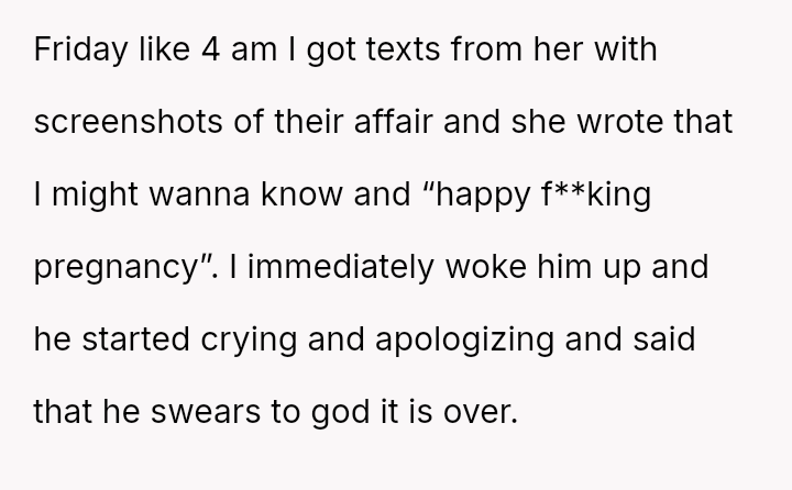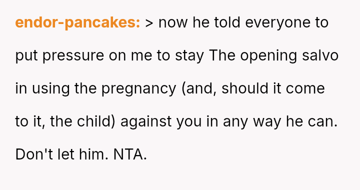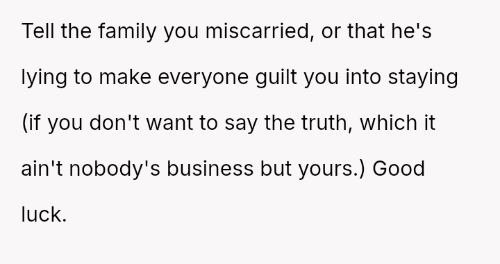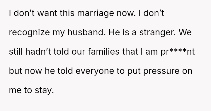Considering the immediate emotional devastation and the husband's attempt to use the pregnancy disclosure as leverage, the central question remains: Is it ever justifiable for one partner to reveal significant personal news to extended family without consent specifically to manipulate the other partner into remaining in a compromised relationship?