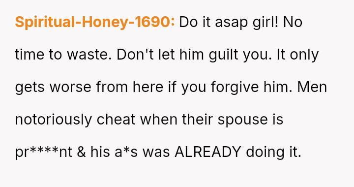 The original poster is experiencing profound shock and betrayal early in her pregnancy, leading her to immediately question the future of her marriage.