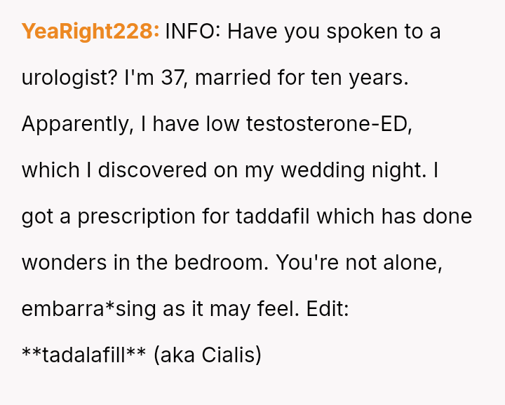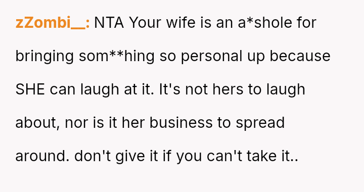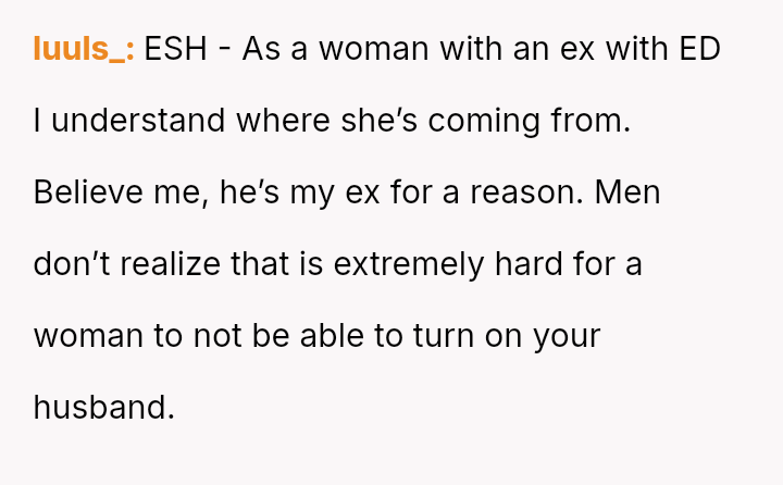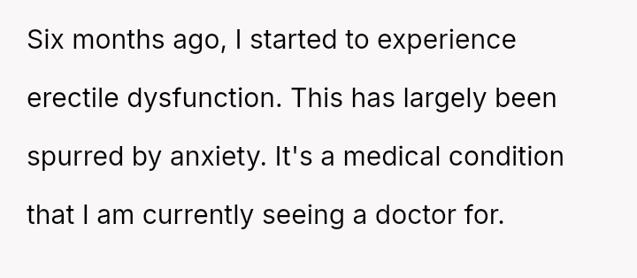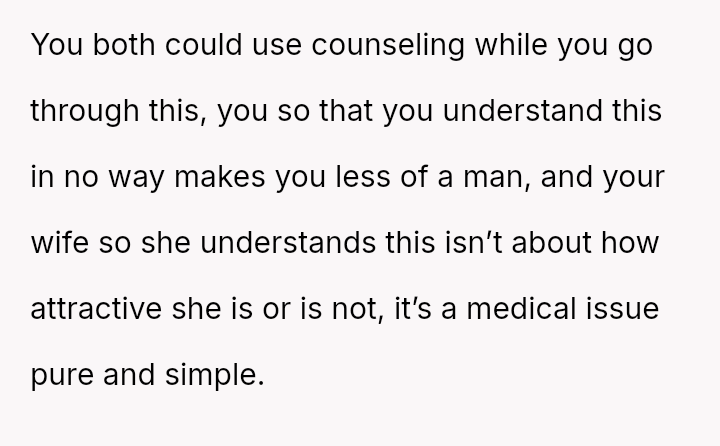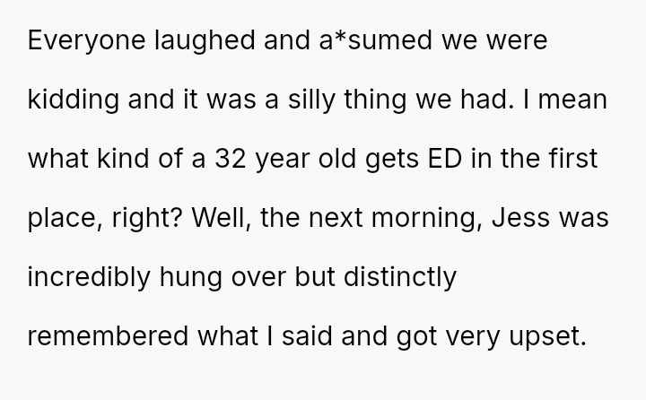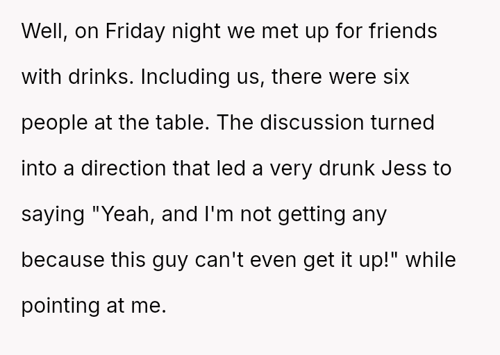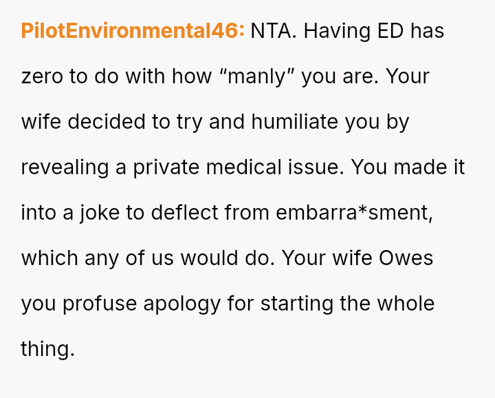 The original poster (OP) is dealing with the stress of new erectile dysfunction and feels deeply hurt and exposed after his wife publicly mocked his private medical issue in front of friends.