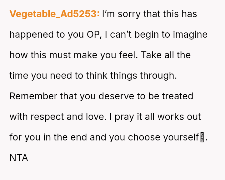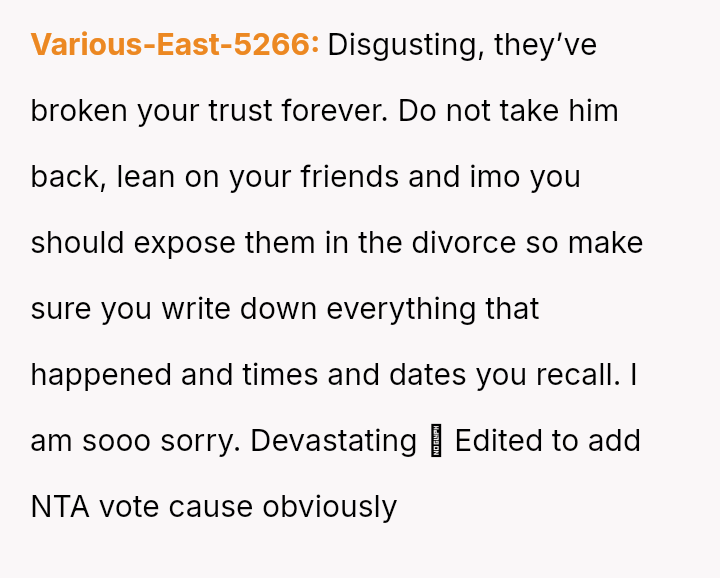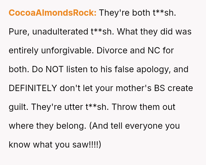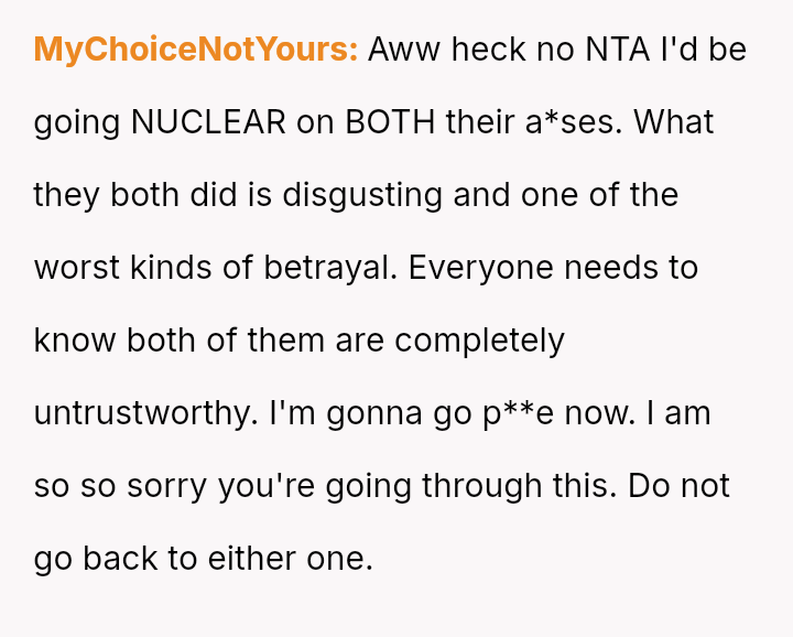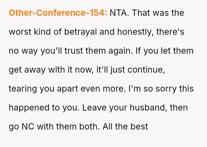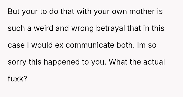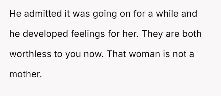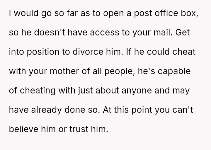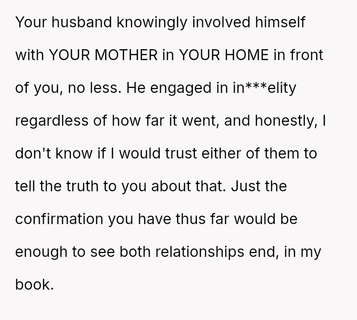 The original poster (OP) is facing a severe emotional crisis, dealing with the discovery of in***elity involving both her husband and her mother.