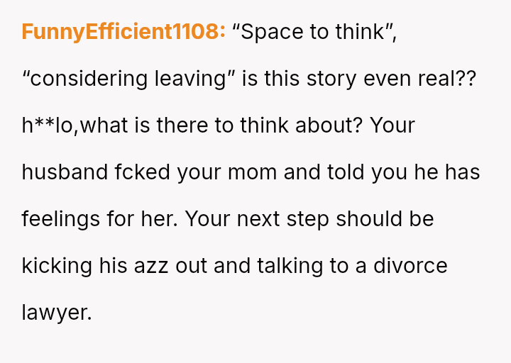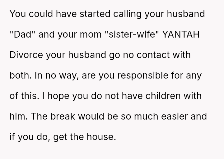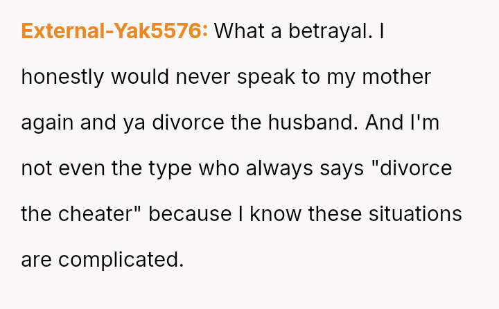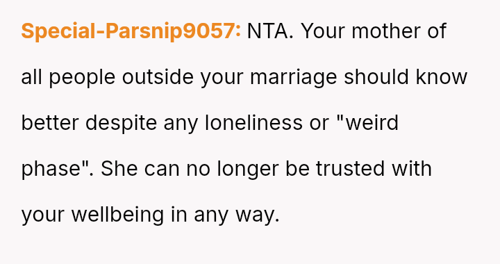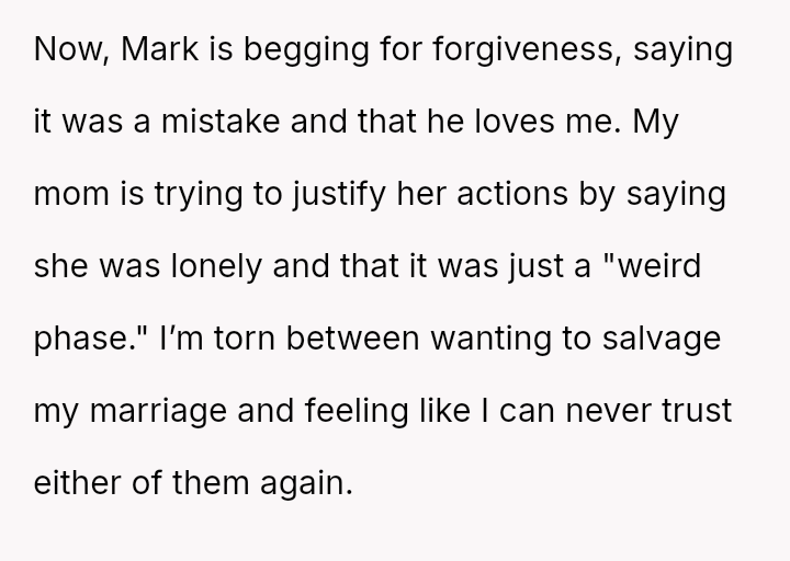 Given the depth of the v***ation by both parties, is the OP justified in considering the end of her marriage and the complete severance of the relationship with her mother, or would attempting reconciliation, given the severity of the betrayal, represent an unsustainable emotional risk?