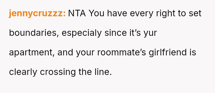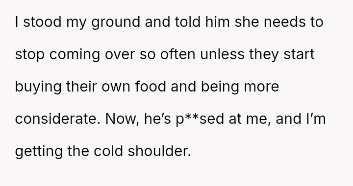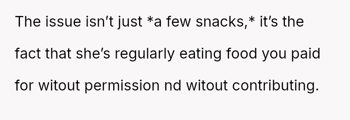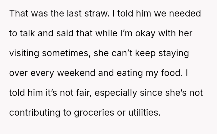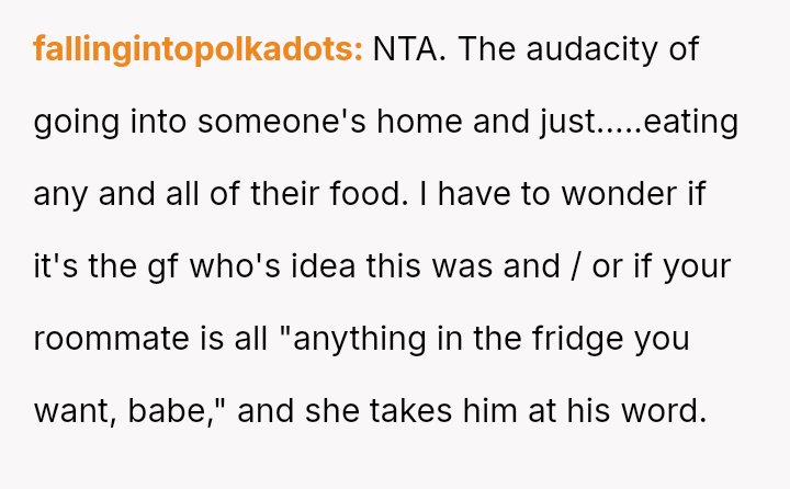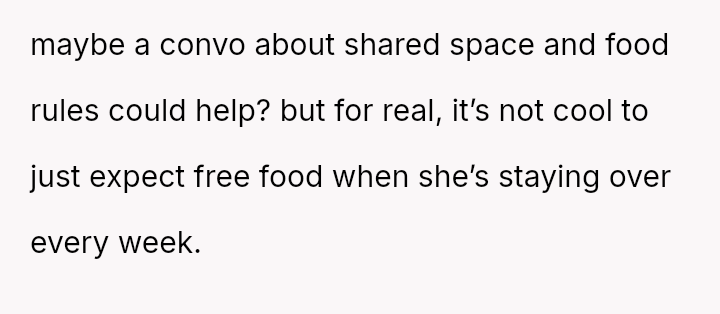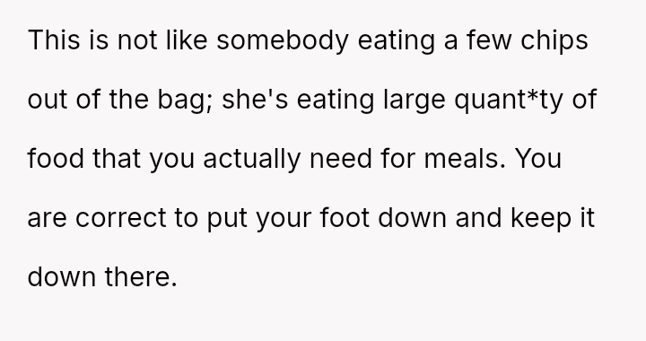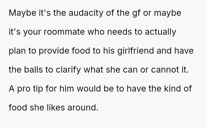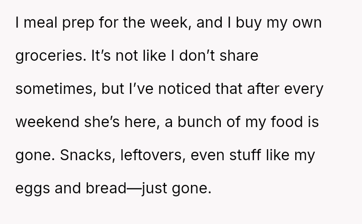 The original poster (OP) reached a breaking point after finding their pre-planned meals and groceries repeatedly consumed by their roommate's girlfriend, who was staying over frequently without contributing.