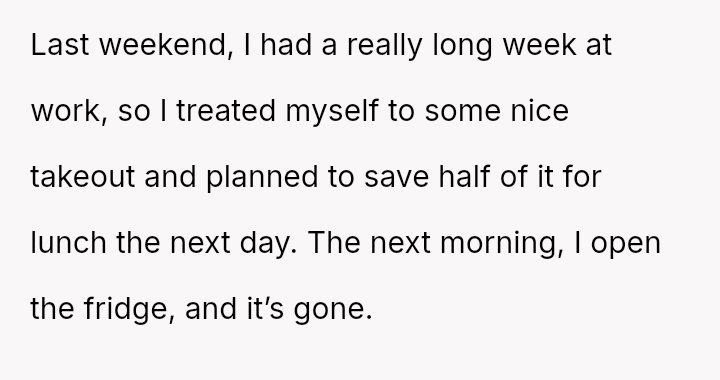 The silent theft of his meals became a painful symbol of boundaries crossed and respect ignored. After a grueling week, the final betrayal came not with a confrontation but with an empty fridge and an apology that stung deeper than hunger.