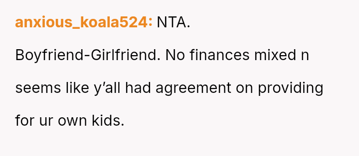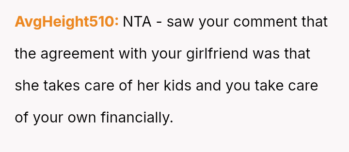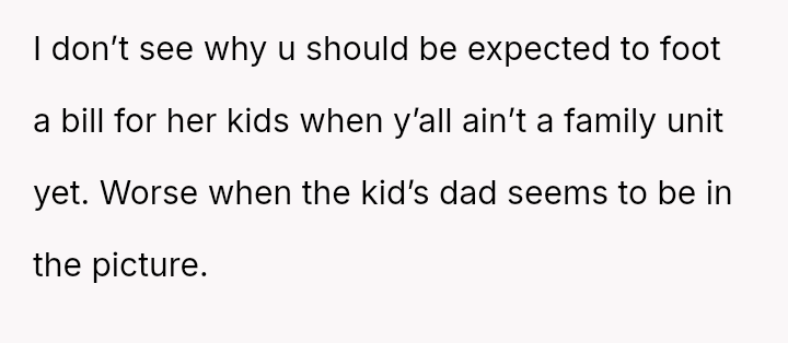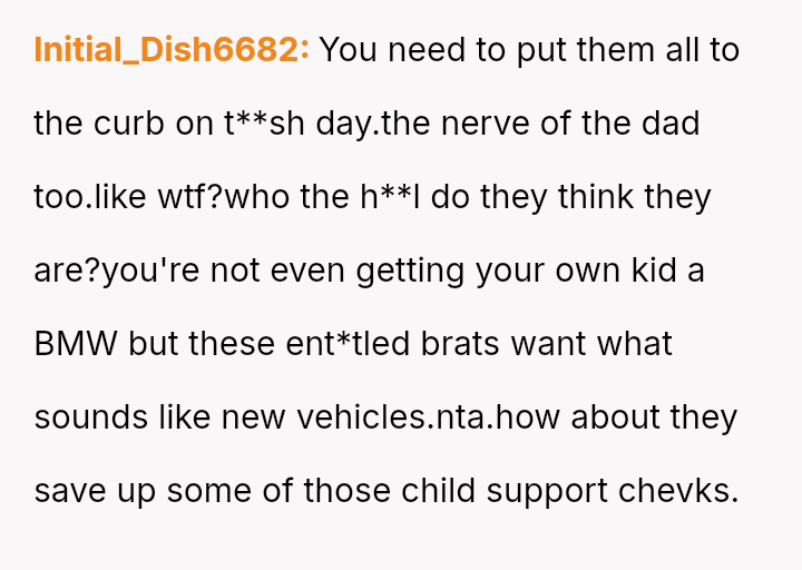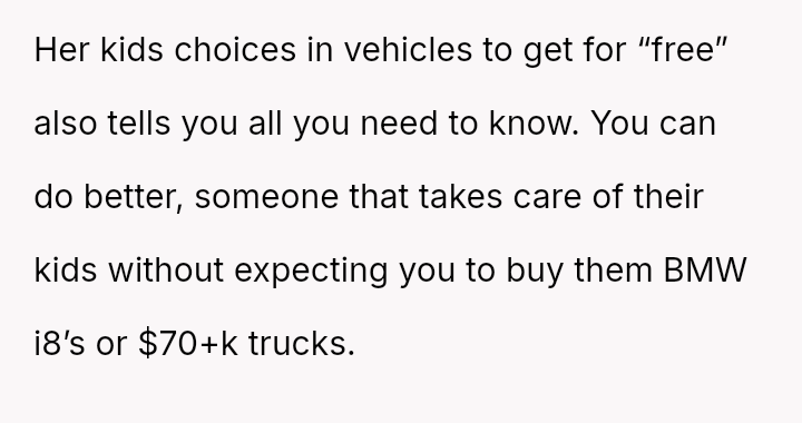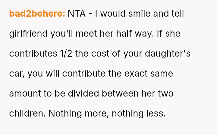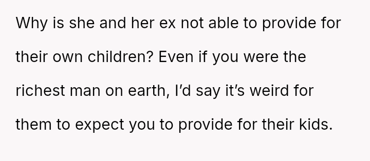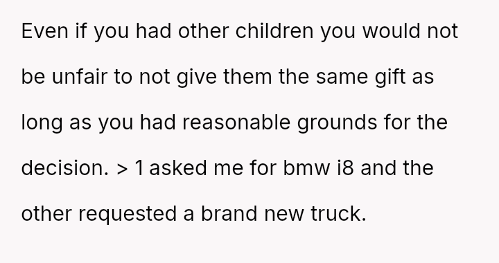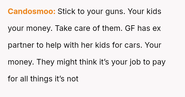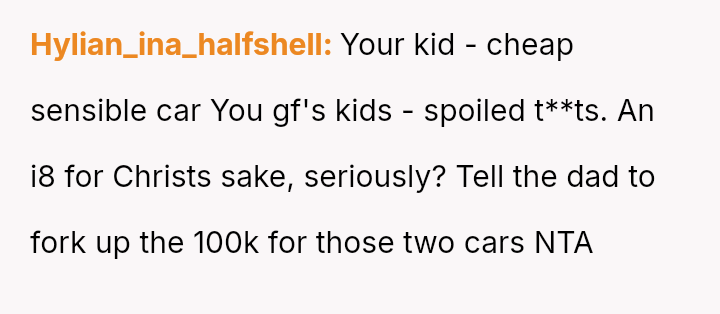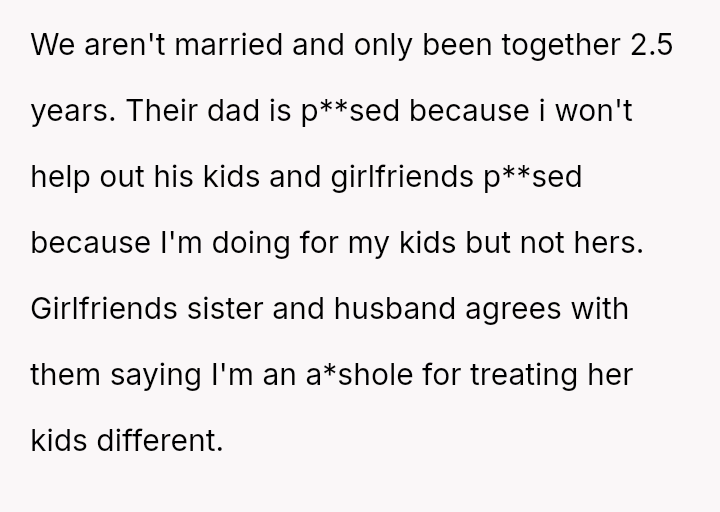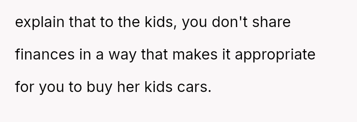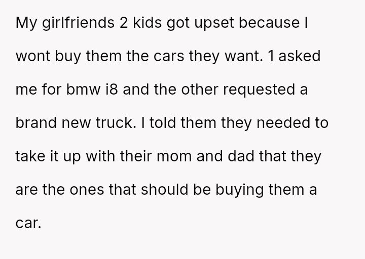 Given the clear distinction between financial obligations to one's own child versus a partner's child in a relationship that is not legally bound by marriage, is the OP justified in refusing to fund the extravagant car requests of his girlfriend's children, or does this refusal const*tute unfair differential treatment that threatens the s**bility of his current relationship?