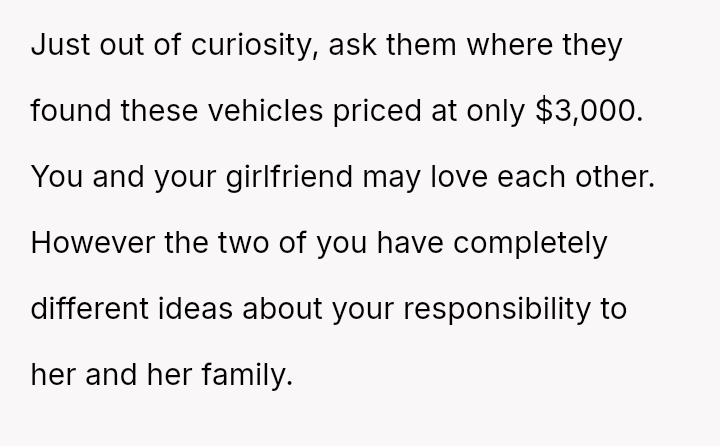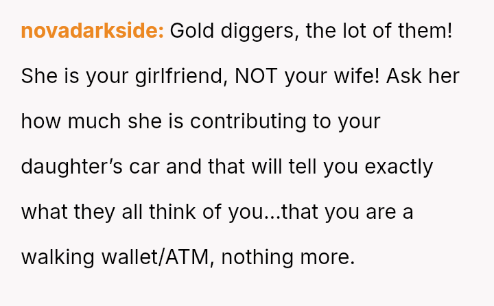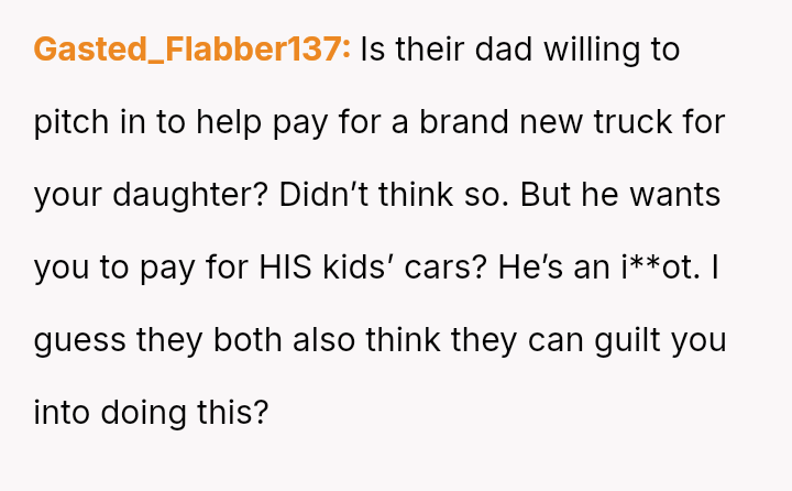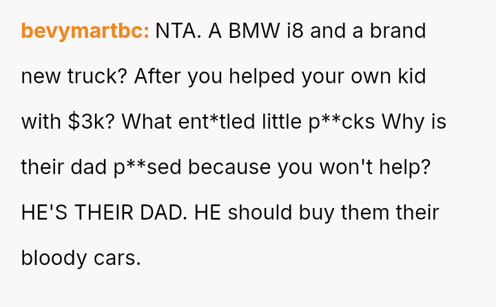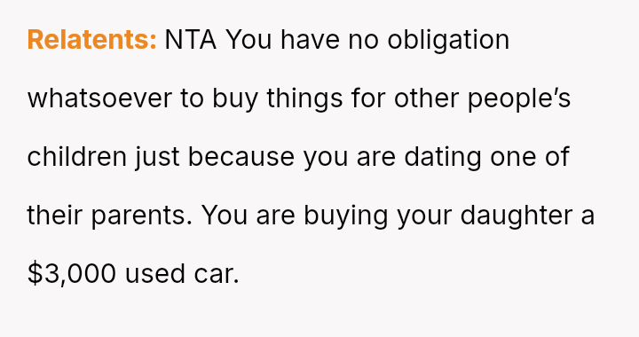 The original poster (OP) is facing significant conflict after setting a clear financial boundary regarding a car purchase for his biological daughter, which his girlfriend's children and extended family have strongly rejected.