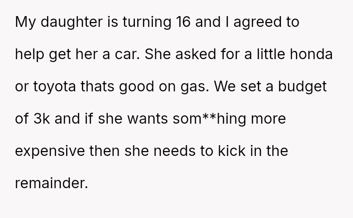 A father, filled with love and responsibility, prepares to gift his daughter a modest car for her 16th birthday—an honest promise grounded in budget and fairness.