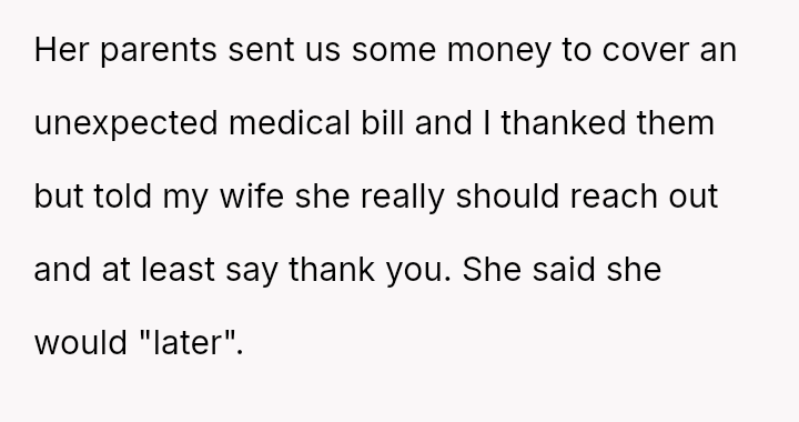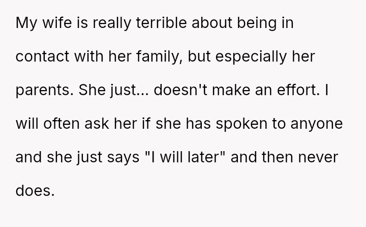 The husband is deeply distressed by his wife's lack of communication with her loving and supportive parents, driven by the severe regret he feels over losing his own parents pr****urely.