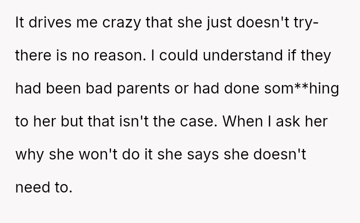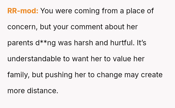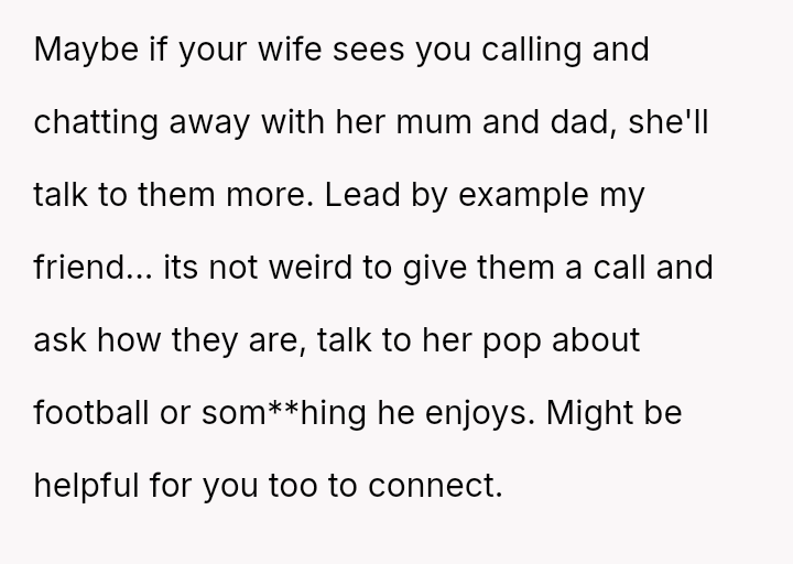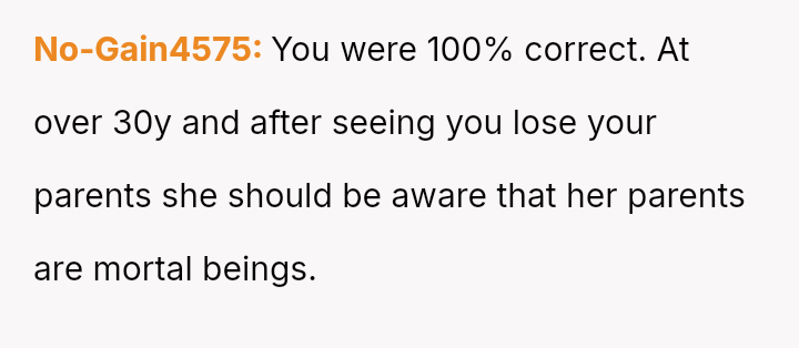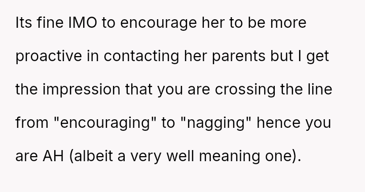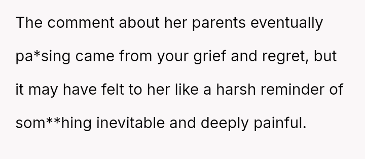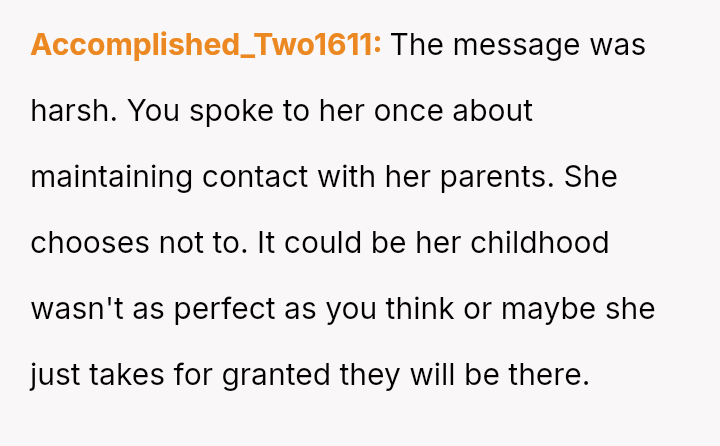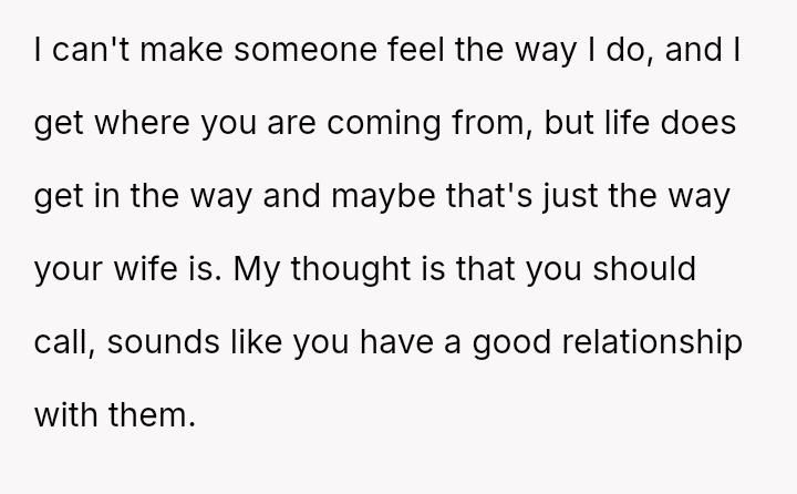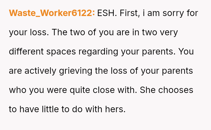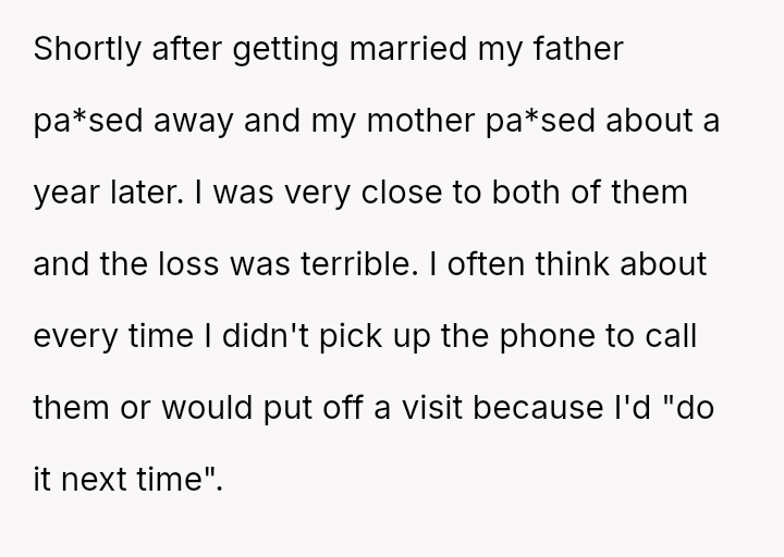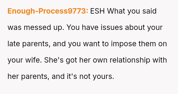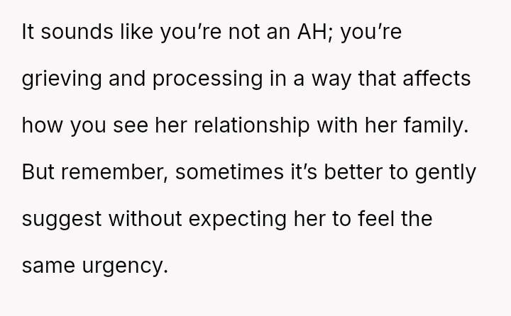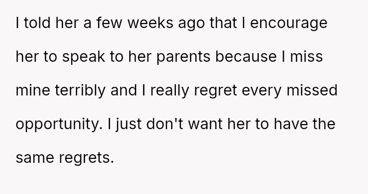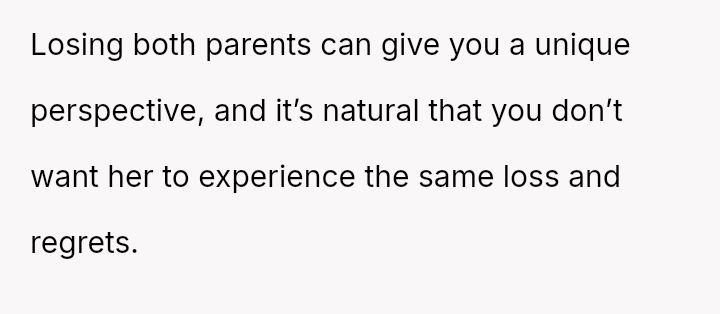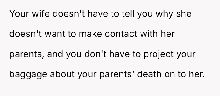 Should the husband prioritize respecting his wife's different emotional needs regarding family contact, or is his fear of future regret a justifiable reason to insist she maintain cl**er ties with her living parents? Where does personal grief end and spousal pressure begin in determining family expectations?