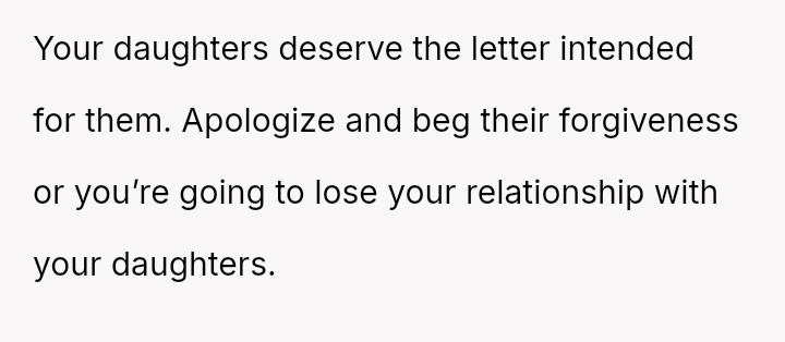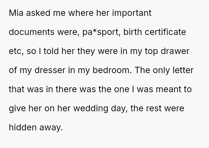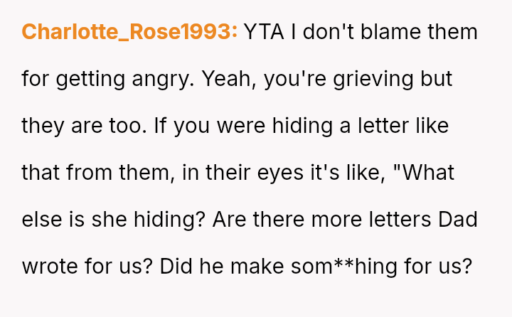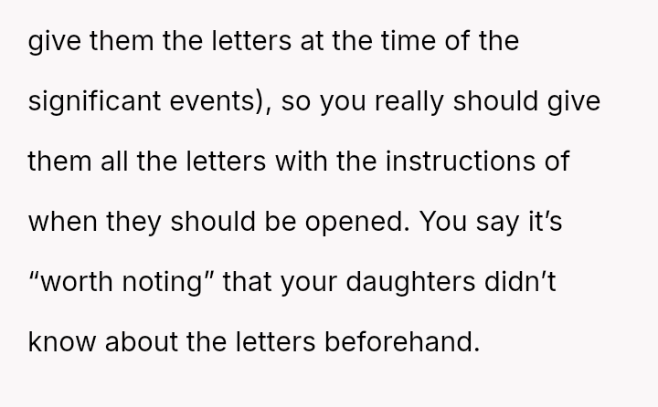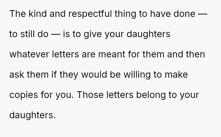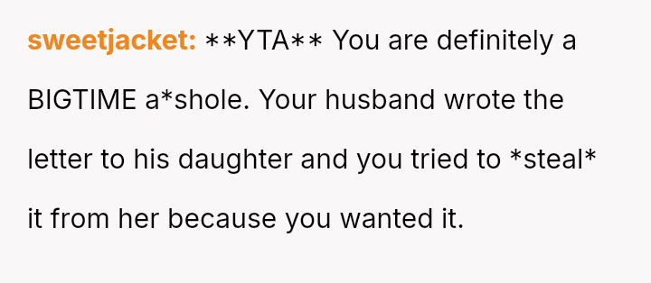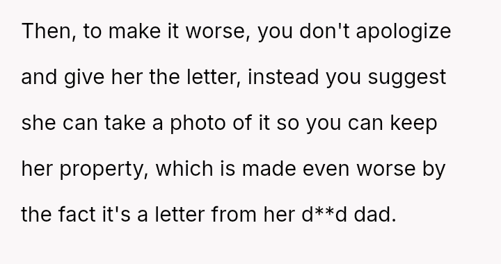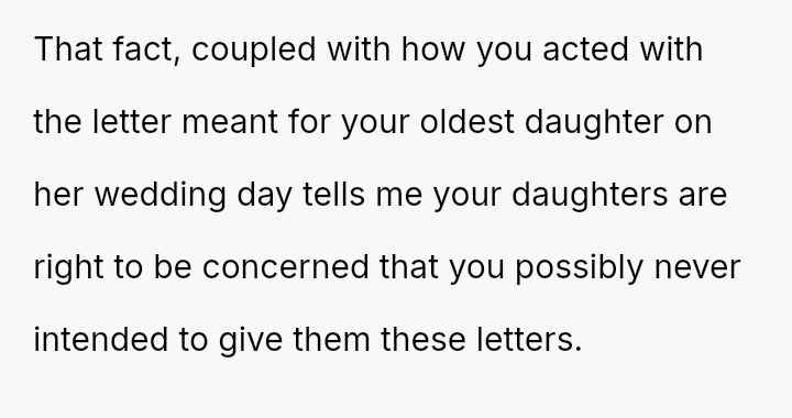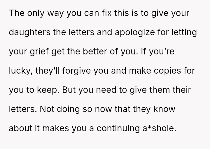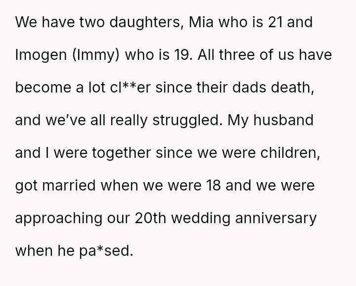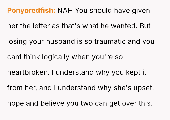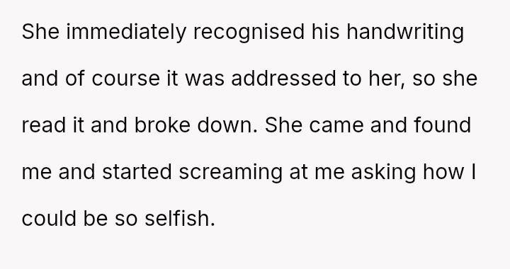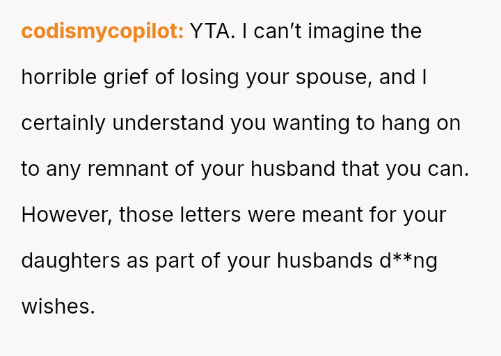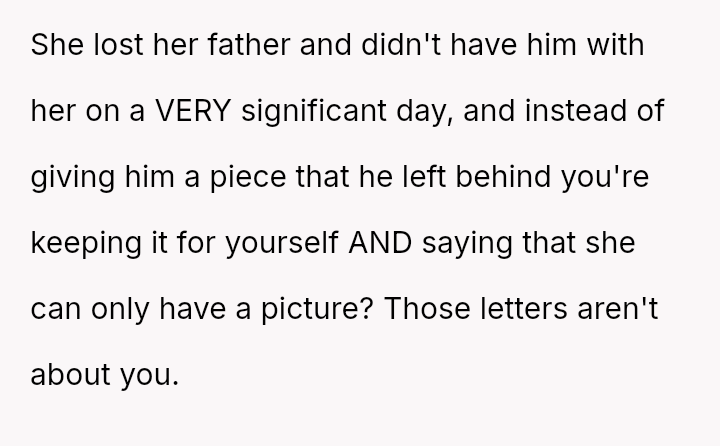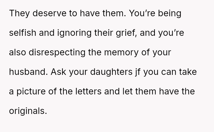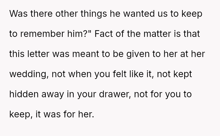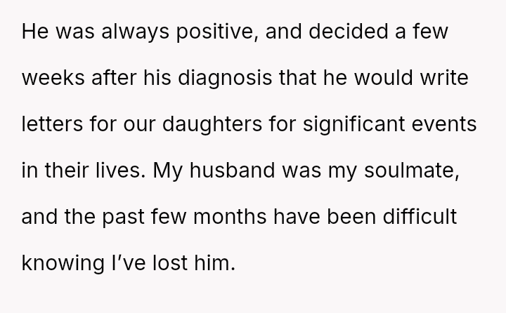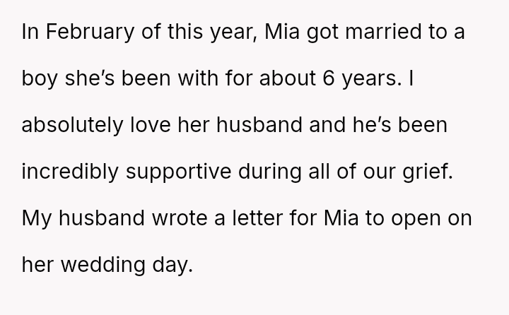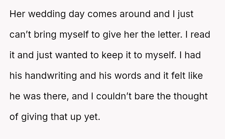 The original poster (OP) is struggling deeply with the loss of her husband, manifesting as an intense need to hold onto tangible memories, specifically the letter he wrote for her elder daughter's wedding.