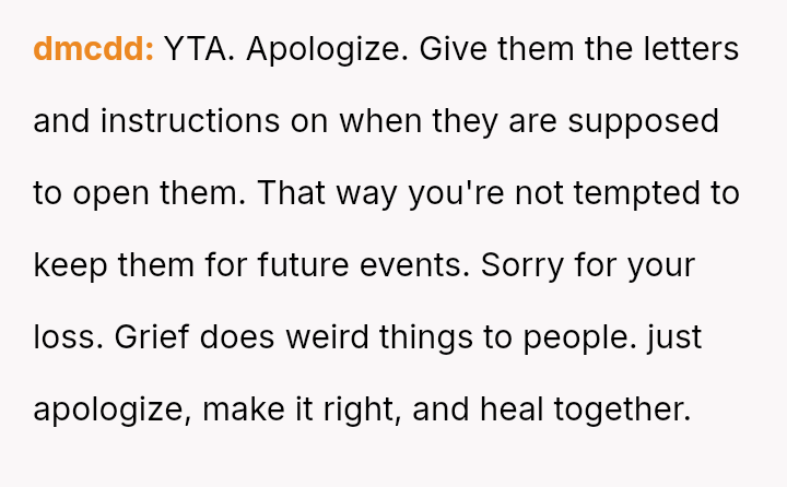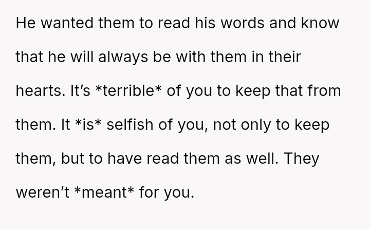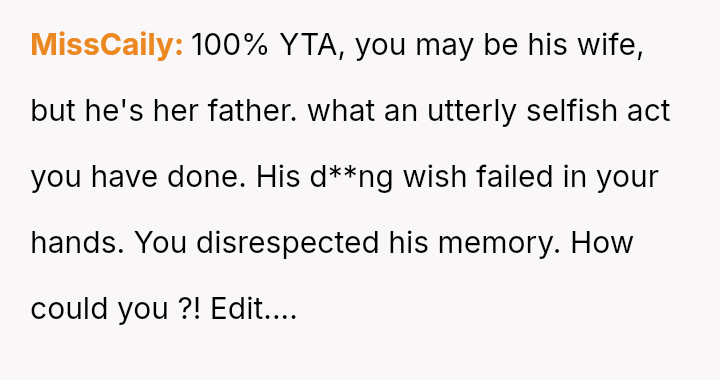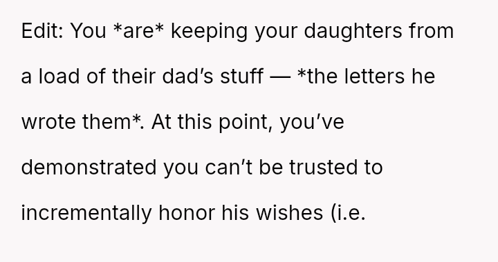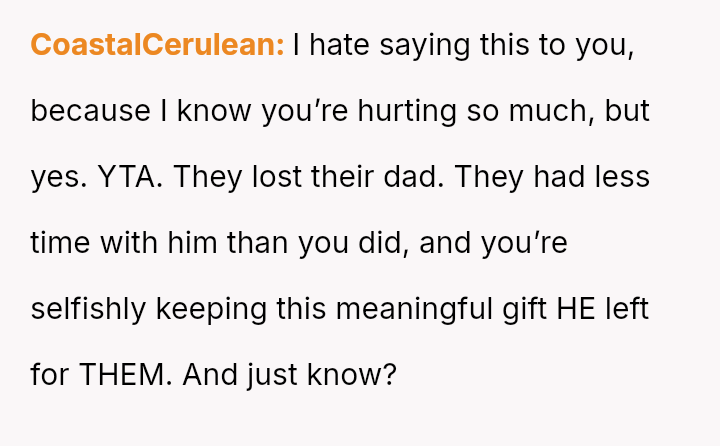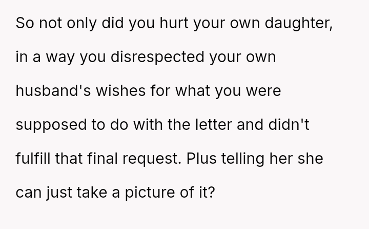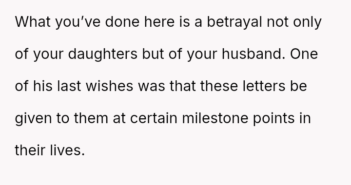 Is the OP justified in prioritizing her immediate need to preserve a connection with her deceased husband over honoring his explicit instructions and her daughter's right to an emotional milestone gift, or was this action a harmful act of grief control that severely damaged trust within the family unit?