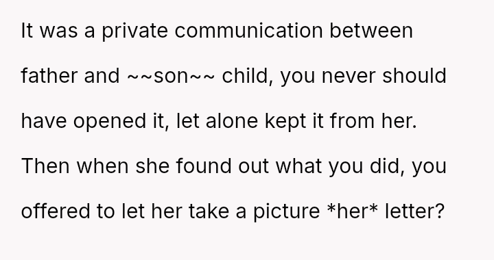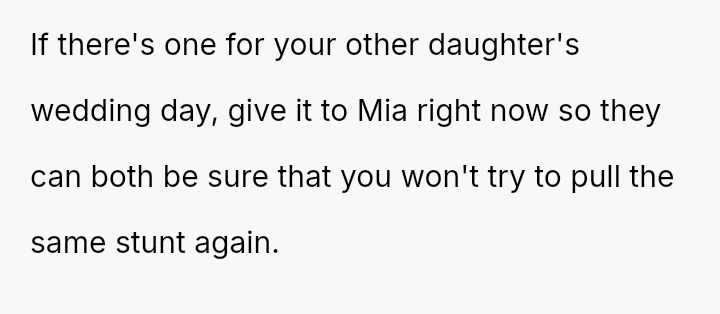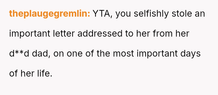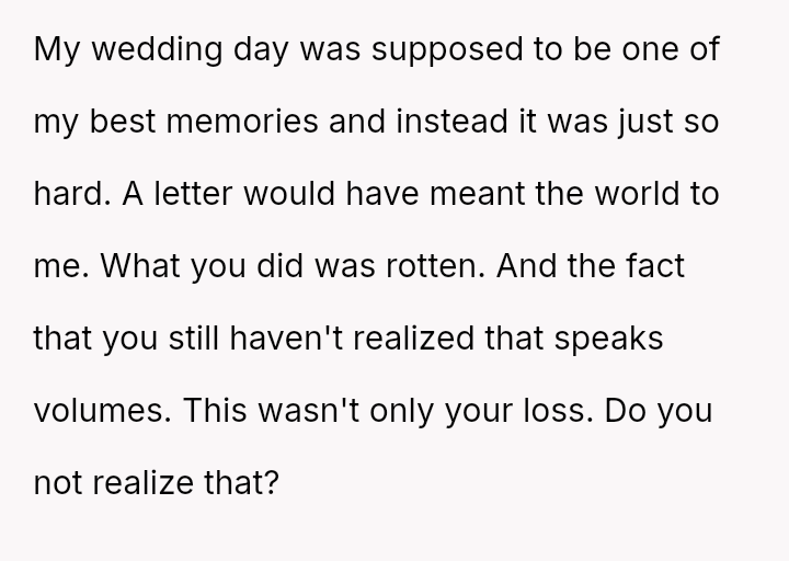Her attempt to safeguard this final connection has directly conflicted with her daughter's expectation and right to receive the intended message on her significant day, leading to accusations of selfishness and severe family distress.