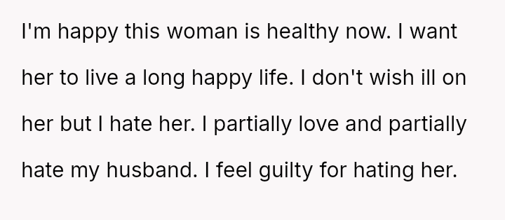 The original poster is in a deeply conflicted emotional state, experiencing a mix of relief for the ex-partner's new partner's recovery and intense personal hatred for the individual who is ending her marriage.