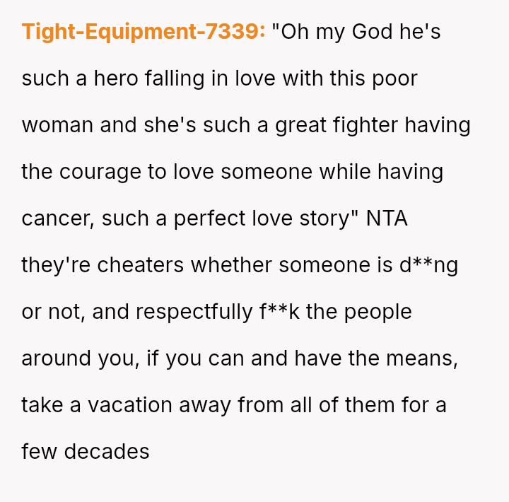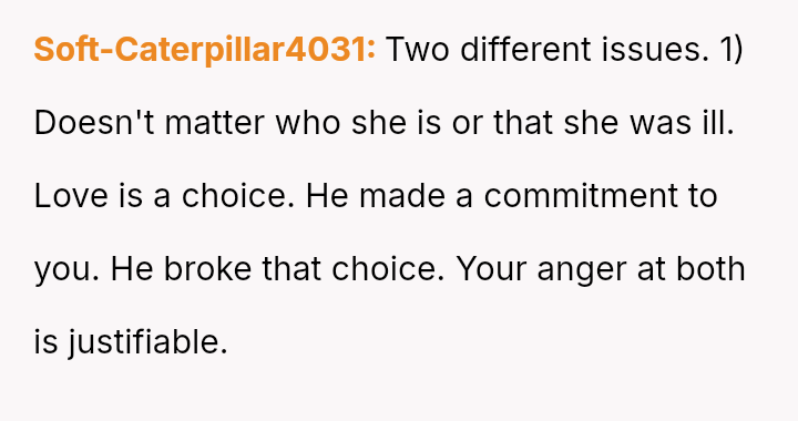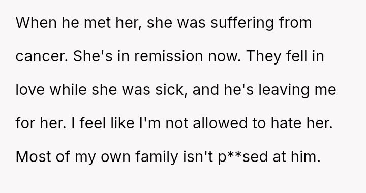 The central conflict lies between the OP's understandable feelings of betrayal and anger toward her husband and the societal pressure, including from her own family, to suppress her negative feelings toward the other woman due to the narrative of a romantic story overcoming illness.