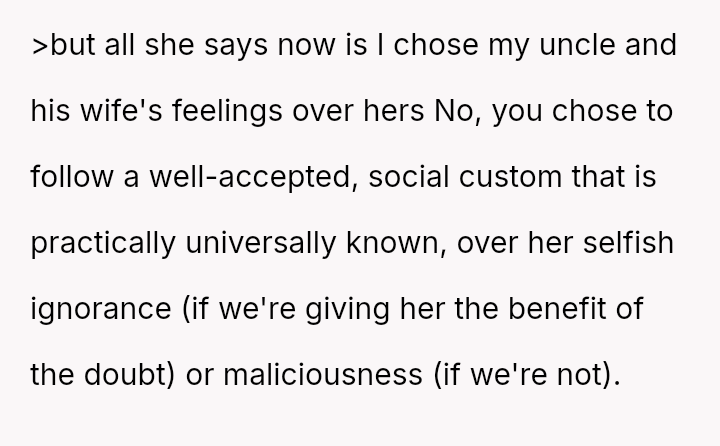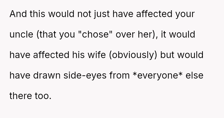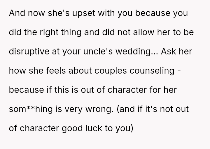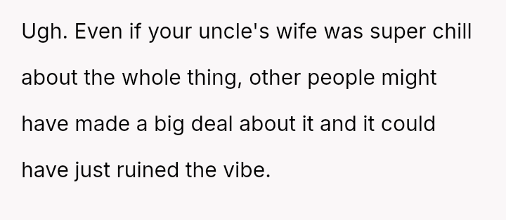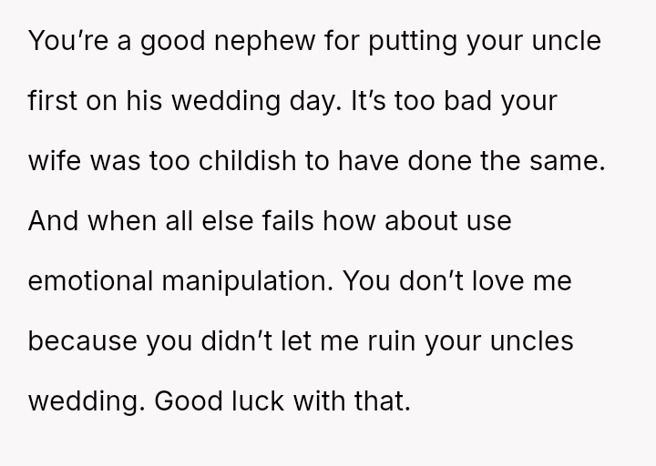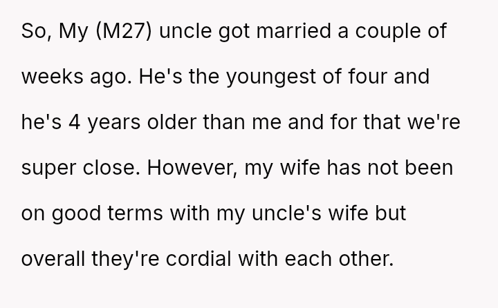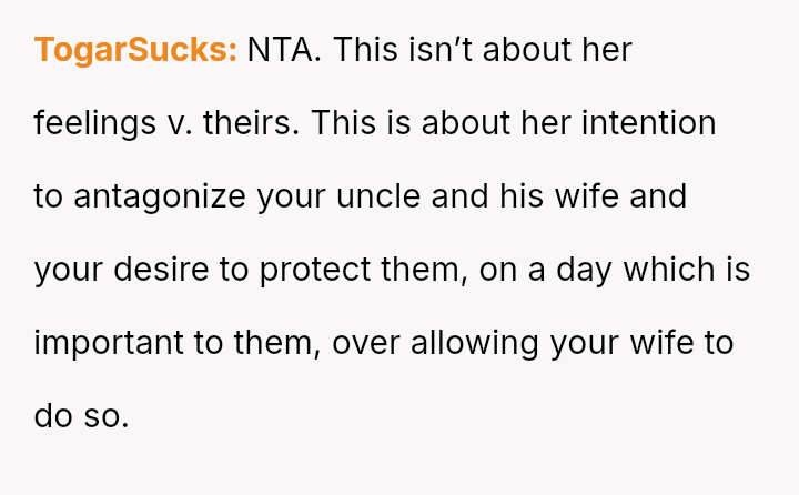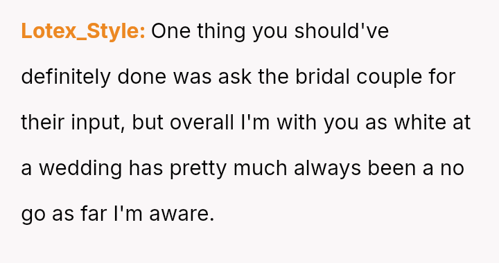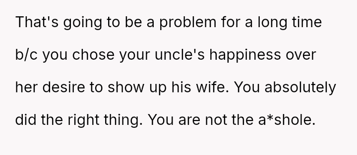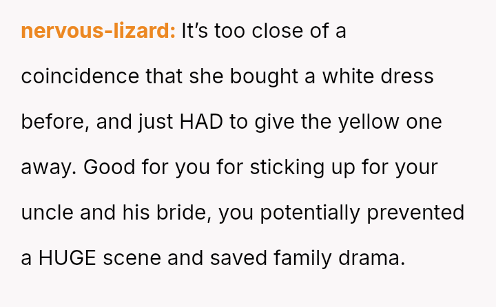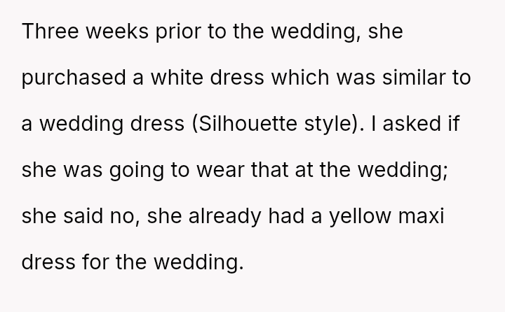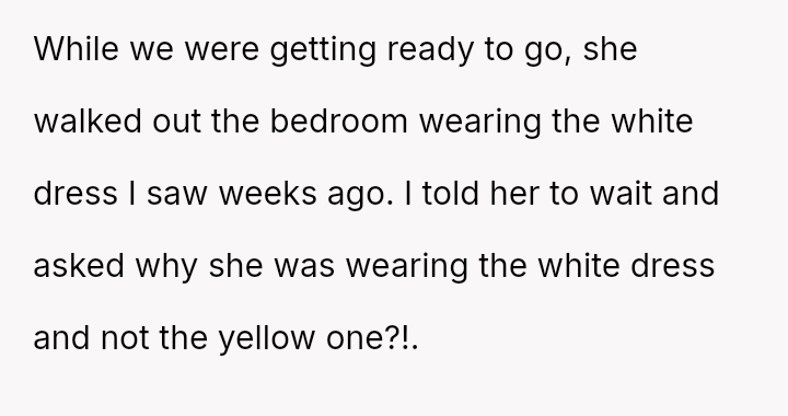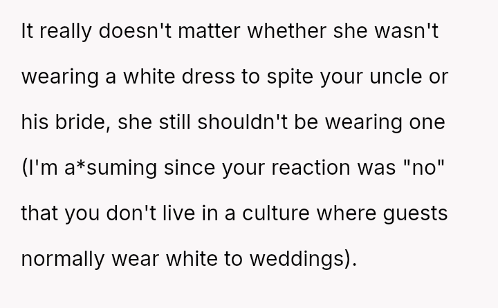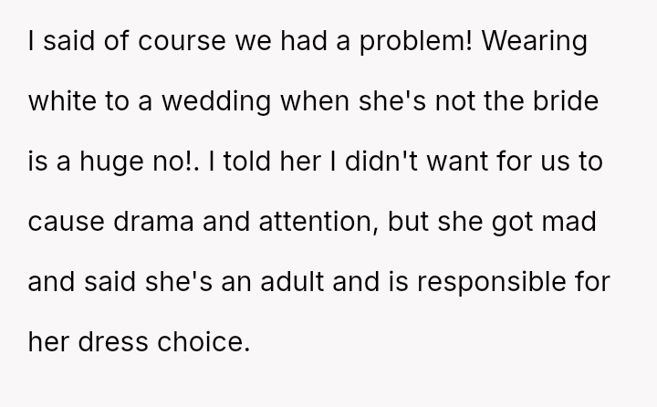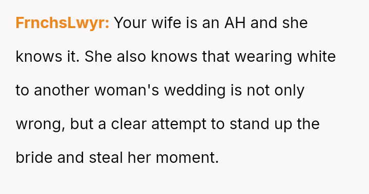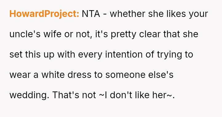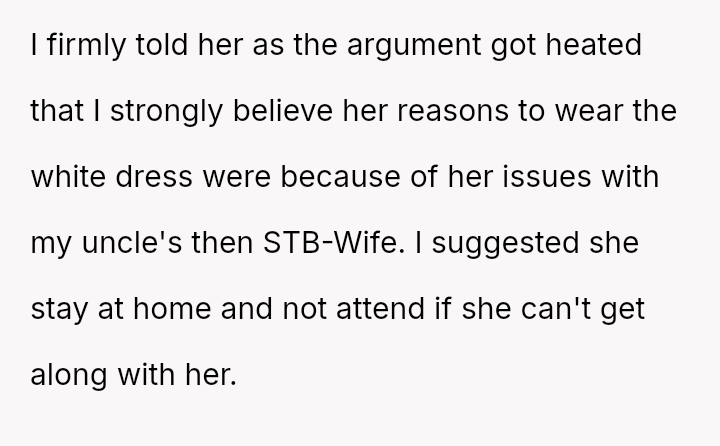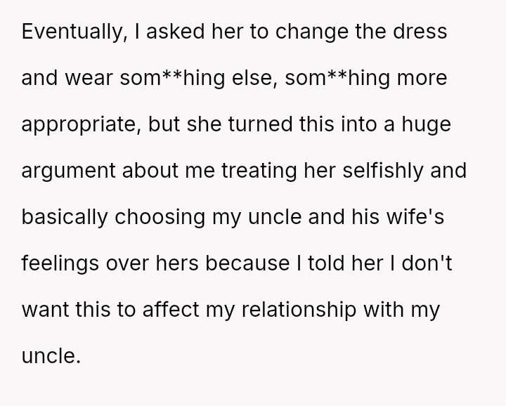 The original poster (OP) faced a significant conflict where his wife chose to wear a white, wedding-like dress to his uncle's wedding, v***ating a major social etiquette rule.