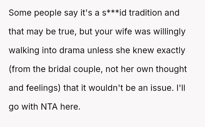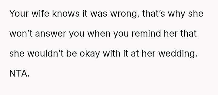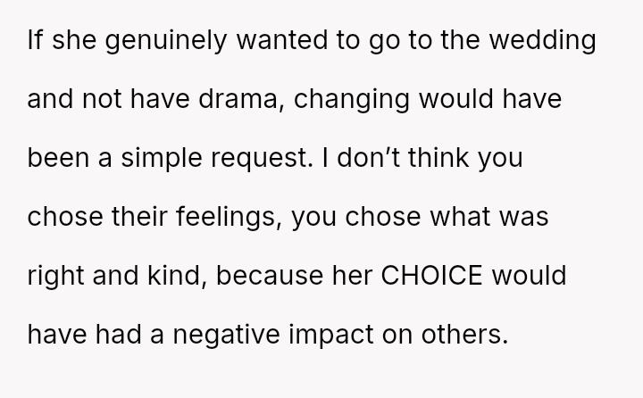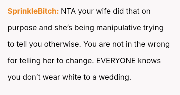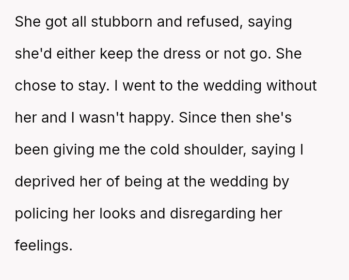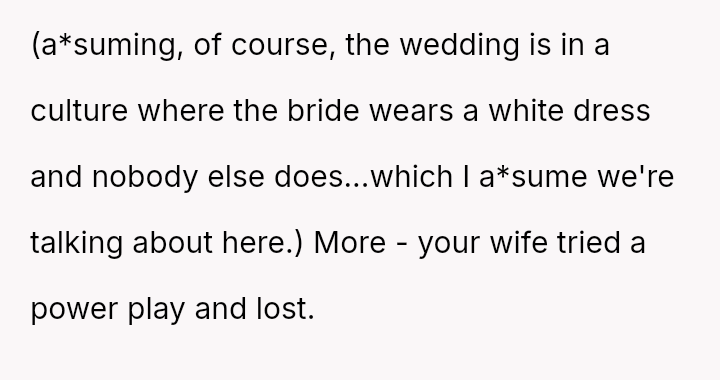 Despite the OP's firm objections based on avoiding wedding drama and respecting social norms, his wife insisted on her right to choose her attire, leading to a complete impa*se where she refused to change and ultimately skipped the event entirely.