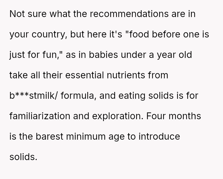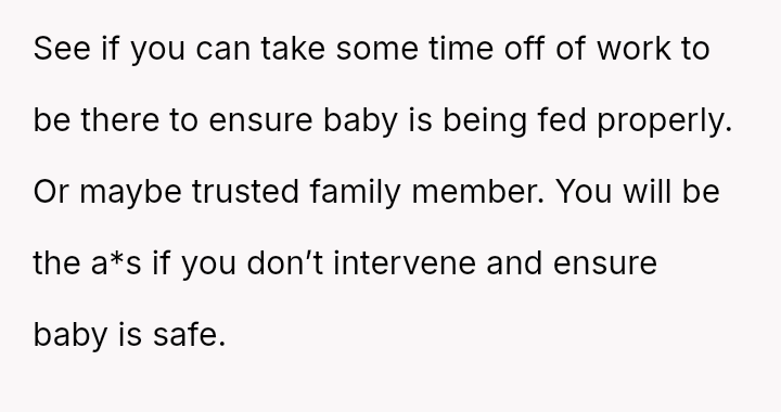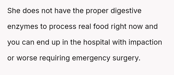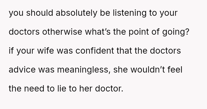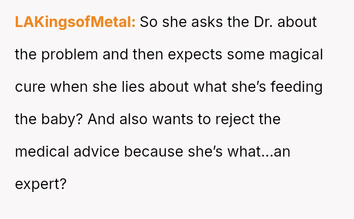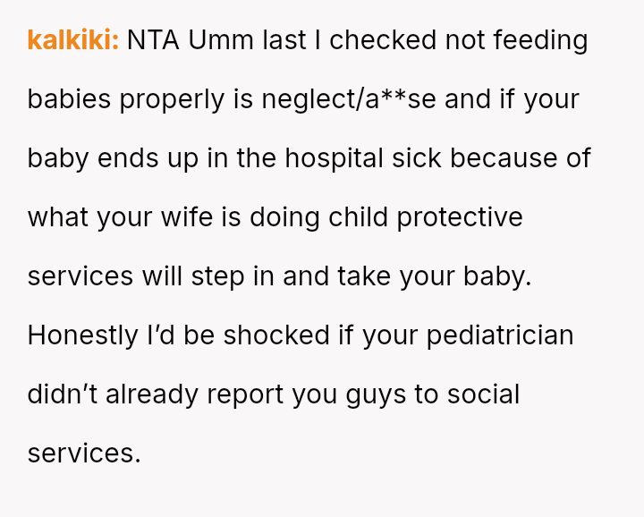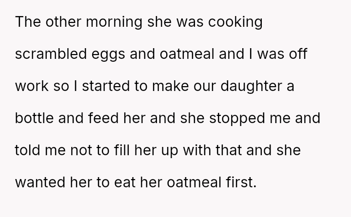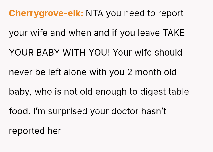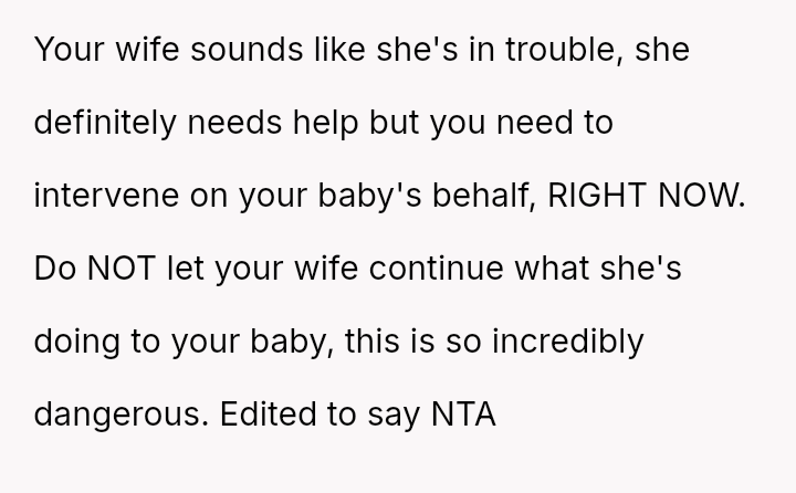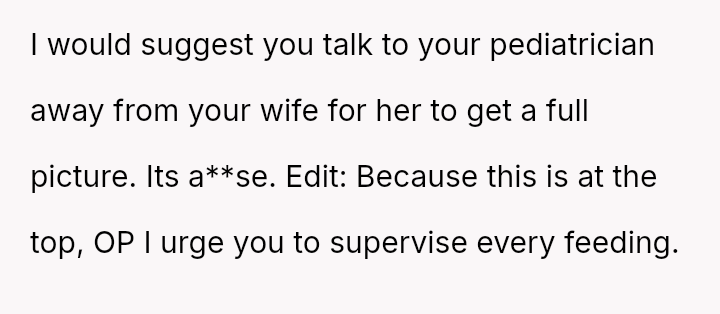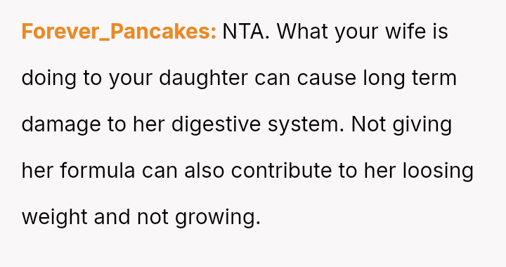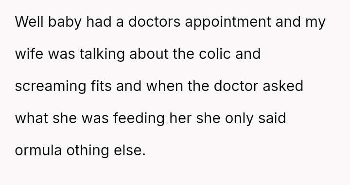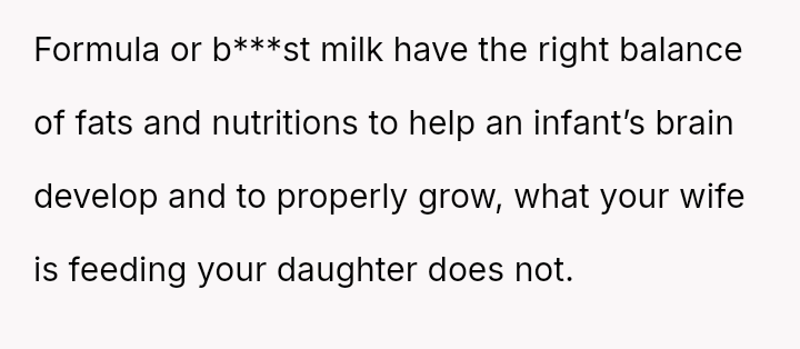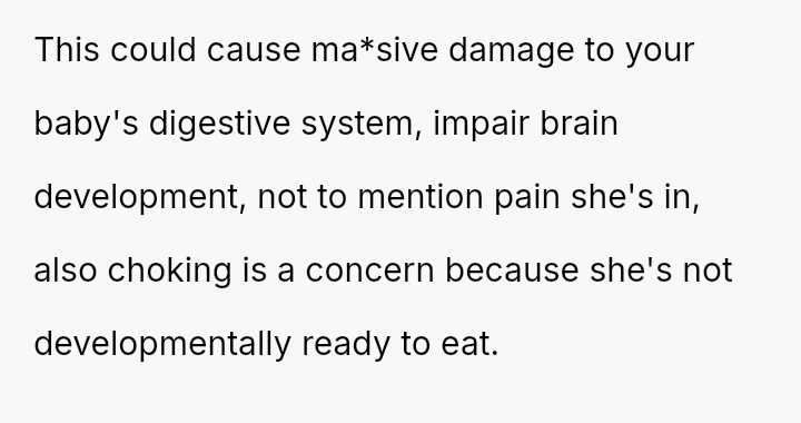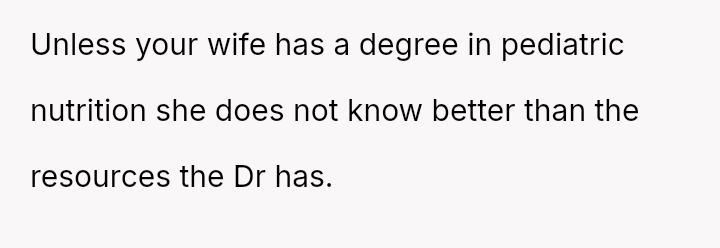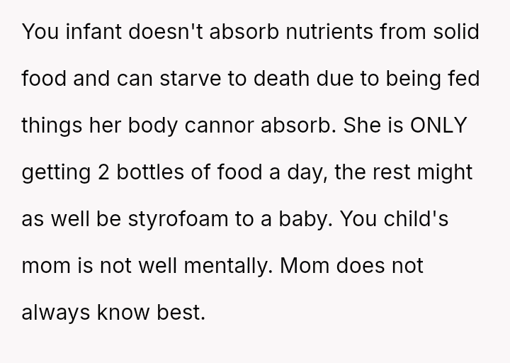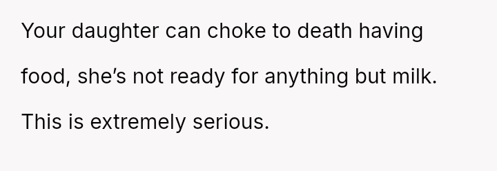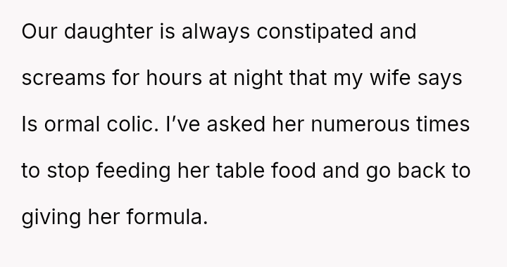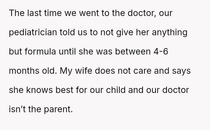 Despite medical advice to nourish their two-month-old with formula alone, his wife stubbornly insists on feeding her an array of inappropriate foods, convinced she knows better than the pediatrician.