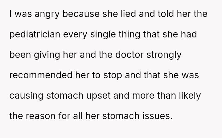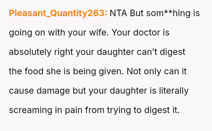 The original poster (OP) is facing a serious conflict stemming from his wife's decision to feed their two-month-old daughter solid foods and sugary liquids against medical advice, leading to the baby's physical discomfort and dishonesty during a medical consultation.