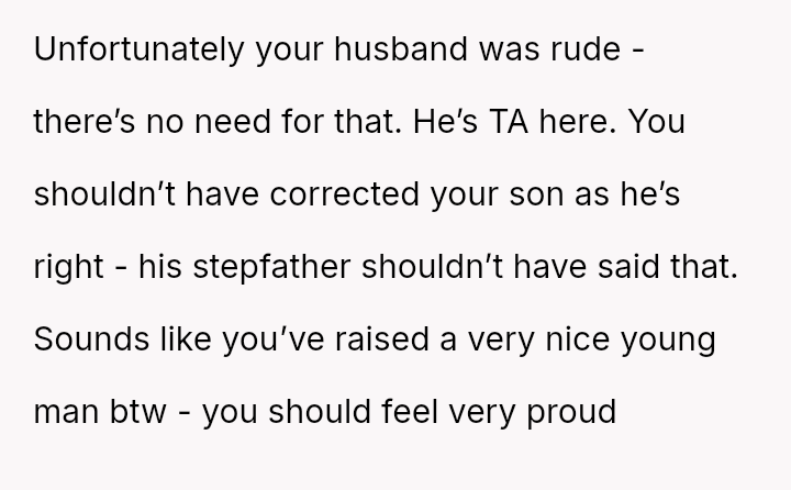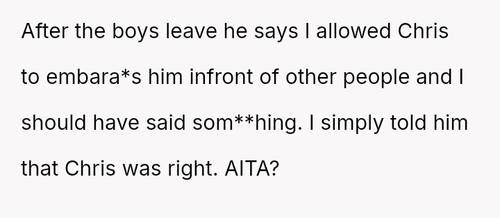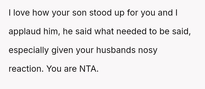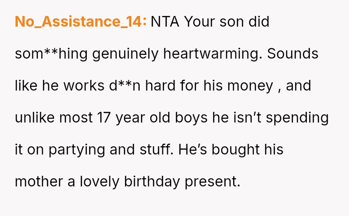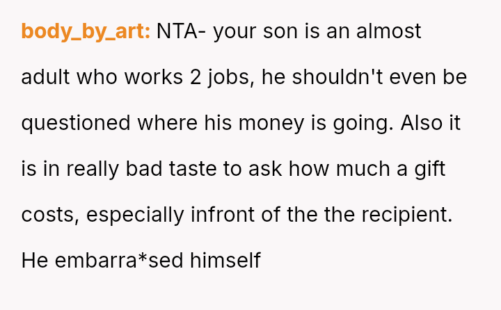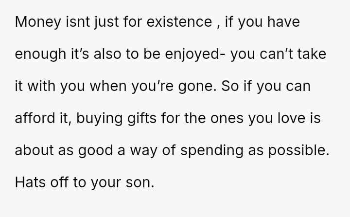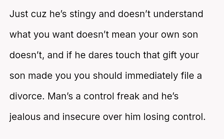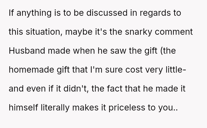 While the OP values the sentimental gift and supports her son's actions, her husband feels publicly embarra*sed and criticized by the exchange, placing the OP in a difficult position regarding her loyalty and her husband's emotional needs.