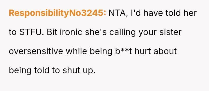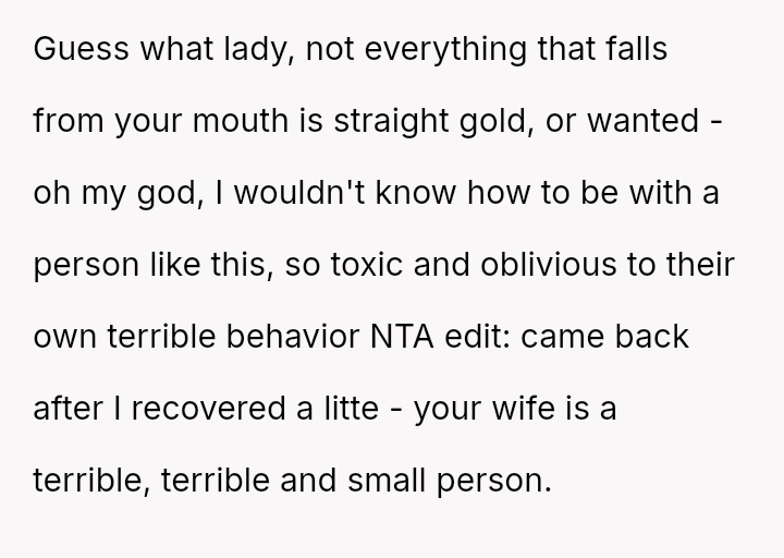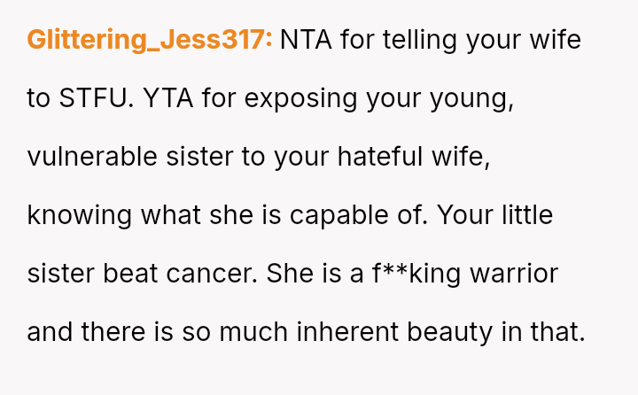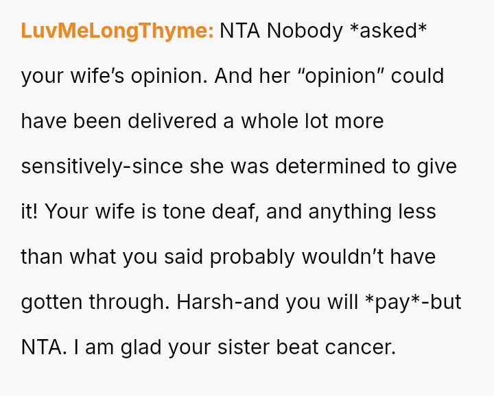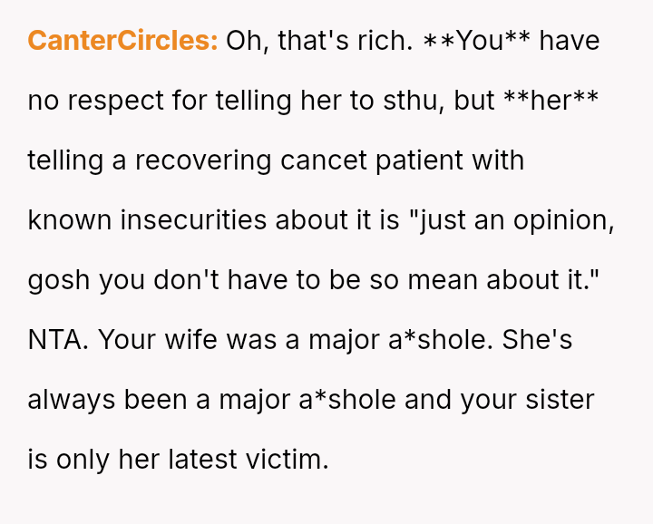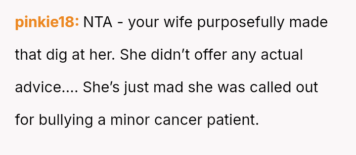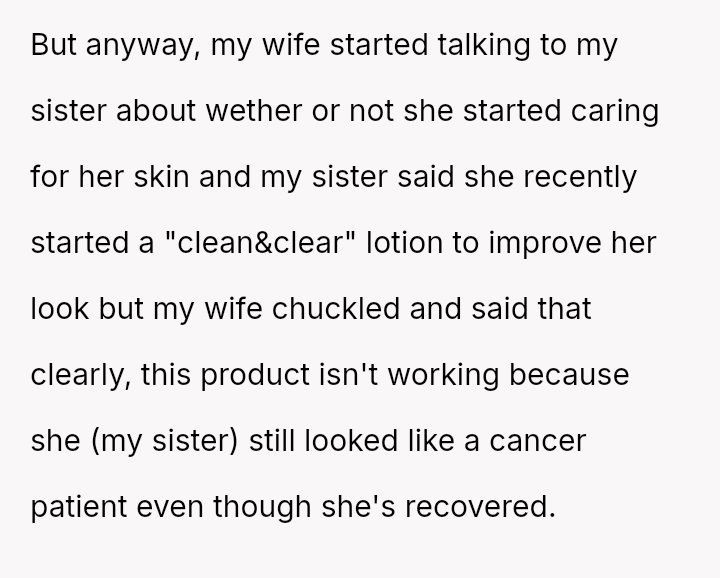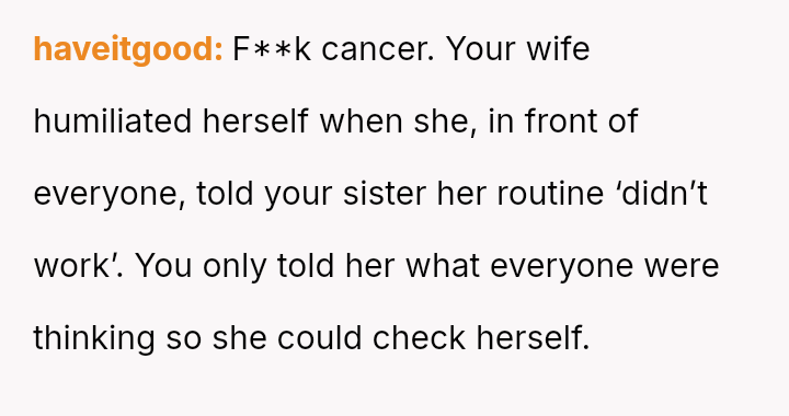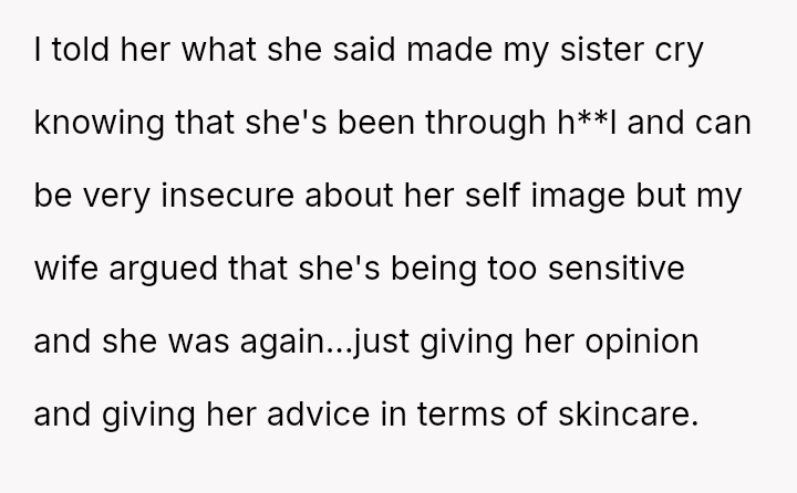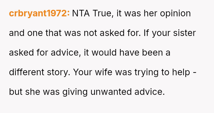 The central conflict arises because the wife believes she was offering unso***ited, though harsh, advice and feels disrespected by the OP's direct confrontation in front of family, while the OP felt compelled to defend his sister against a hurtful and inappropriate comment.