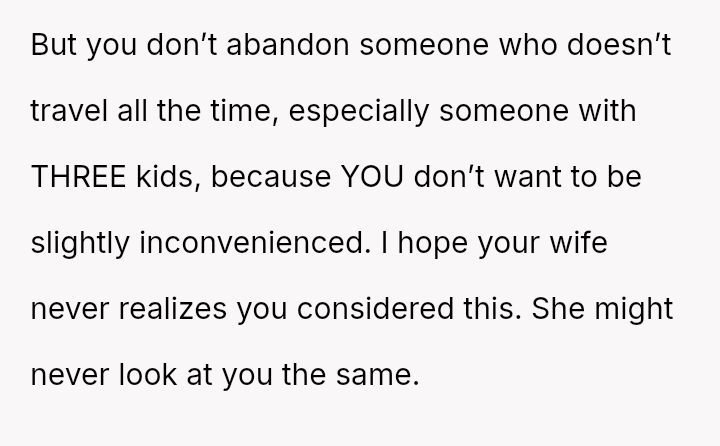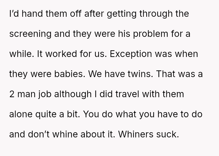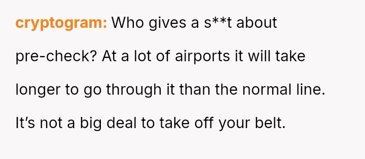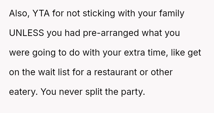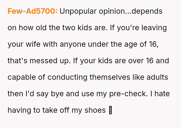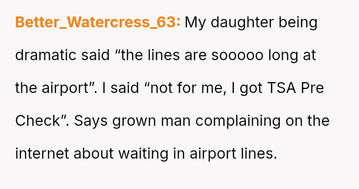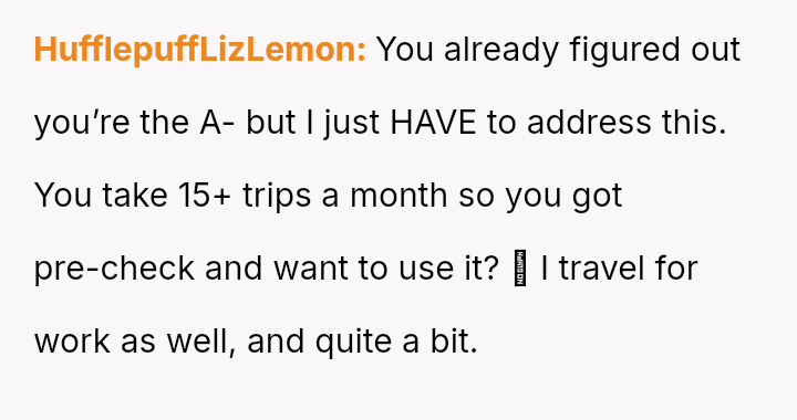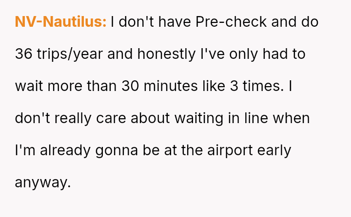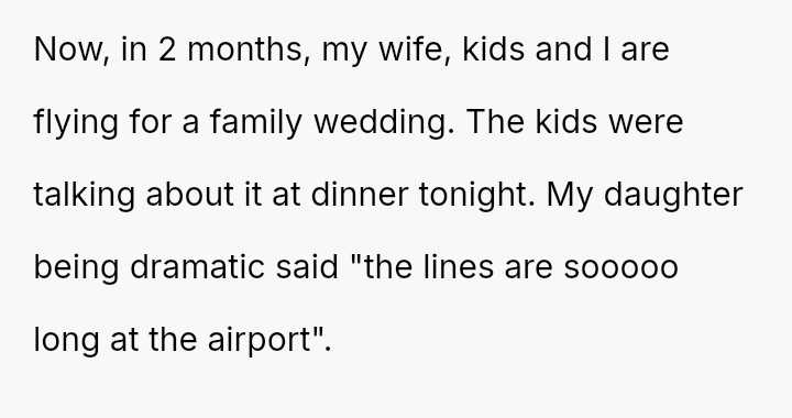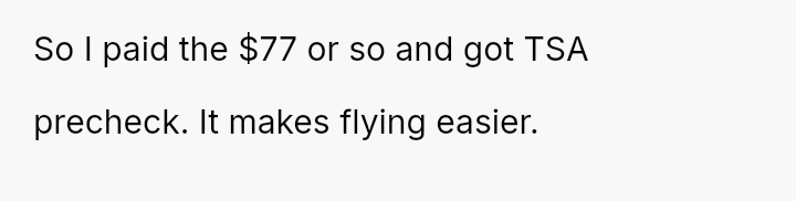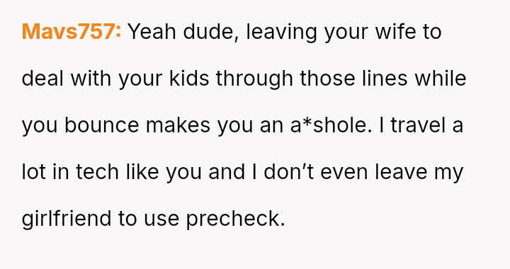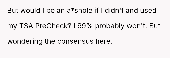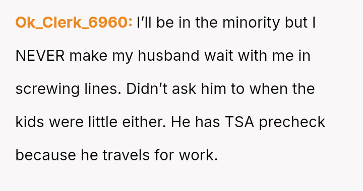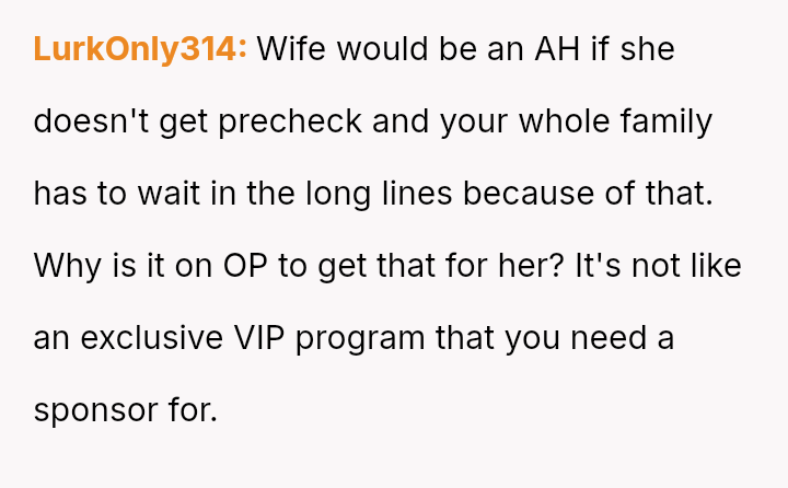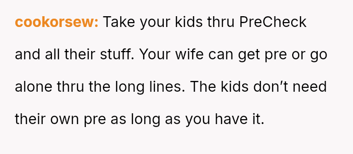 The original poster (OP) faces a conflict between personal convenience, which they paid for via TSA PreCheck, and a perceived obligation to share the family experience, even the tedious parts, with their wife and children during a significant family trip.