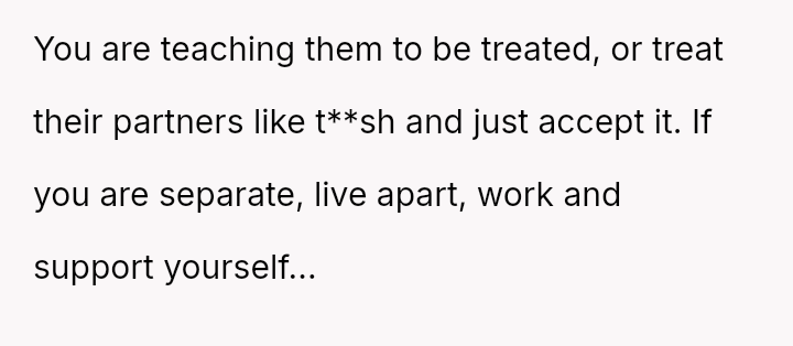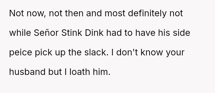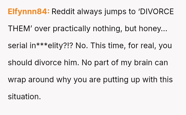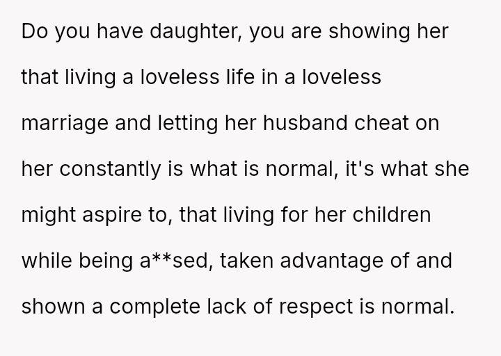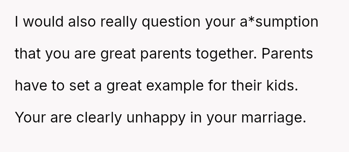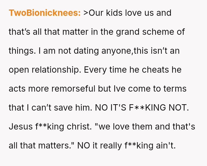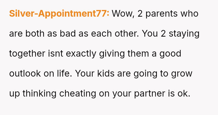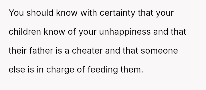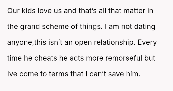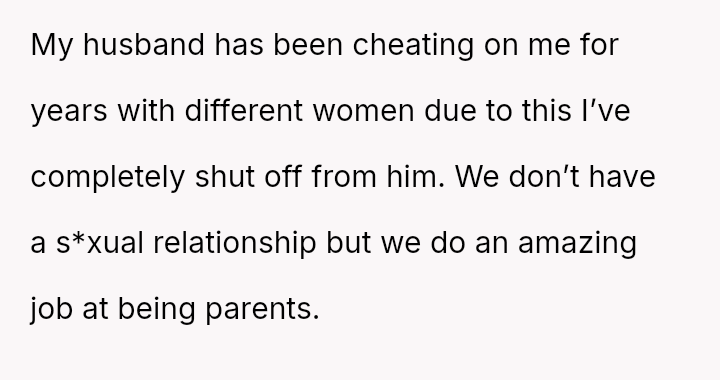 The original poster (OP) is navigating a complex situation where long-term marital in***elity has led to an emotional and physical separation, though they maintain a united front for their children.