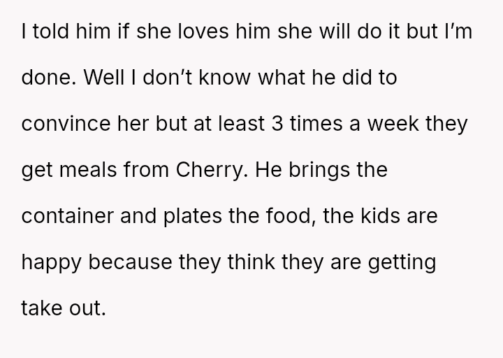 The central conflict arises from the OP's decision to halt her domestic contributions, specifically cooking, and actively encourage her husband's new affair partner to provide meals for the family, framing it as a test of the affair partner's devotion.