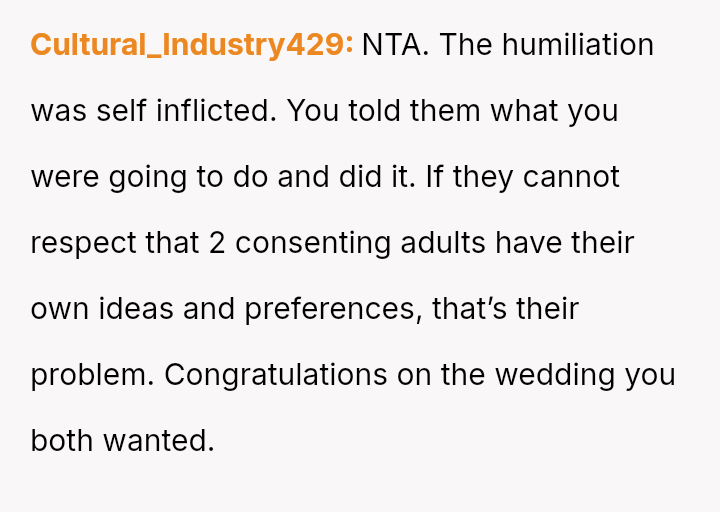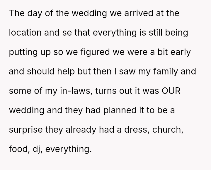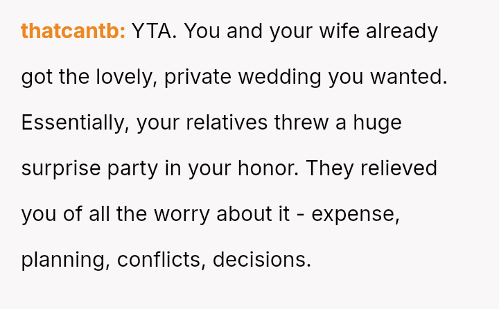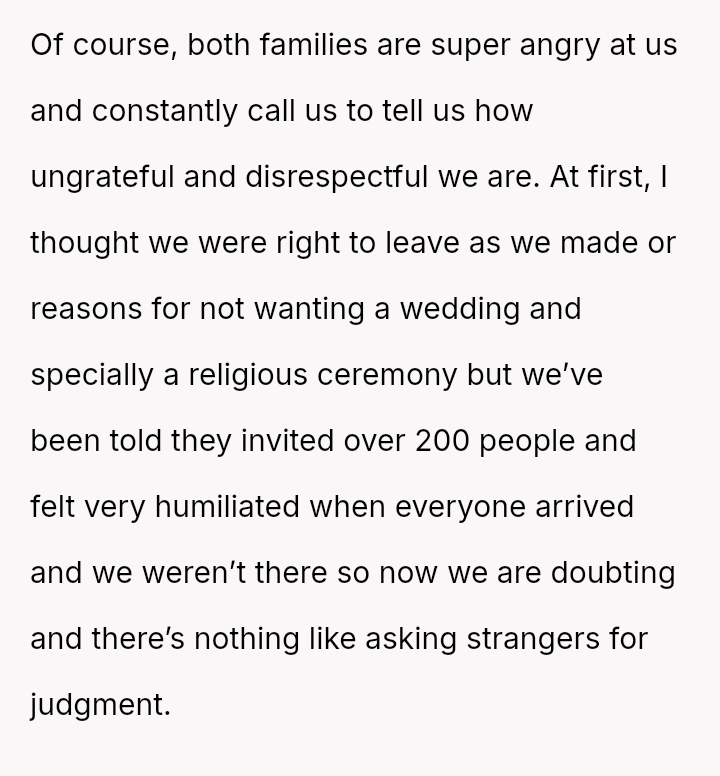 Given that the couple clearly communicated their wishes for a private ceremony, was their decision to leave the surprise event—after being told they could not depart—the appropriate response to a severe boundary v***ation, or were they wrong to reject the expensive, well-intentioned effort made by their families?