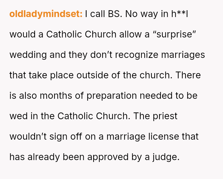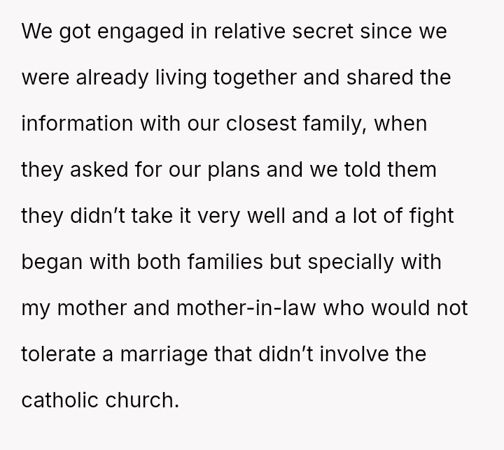 The original poster and his partner desired a private marriage based on their introverted preferences, leading to significant conflict with their families who expected a large, traditional, Catholic ceremony.