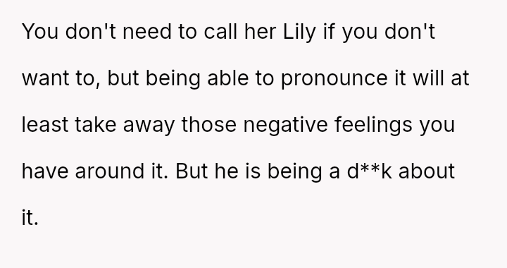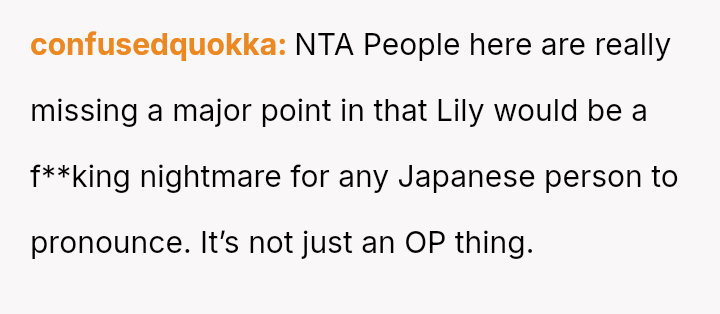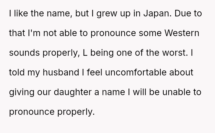 The husband strongly favored the name Lily, a name he had always envisioned for a daughter. The OP expressed discomfort with Lily because, due to her Japanese upbringing, she has difficulty pronouncing the 'L' sound.