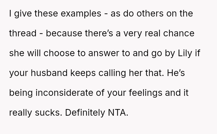The original poster is currently feeling betrayed and disrespected because her husband is unilaterally using the name Lily for their daughter, despite a clear agreement to use Hana.