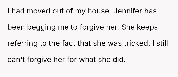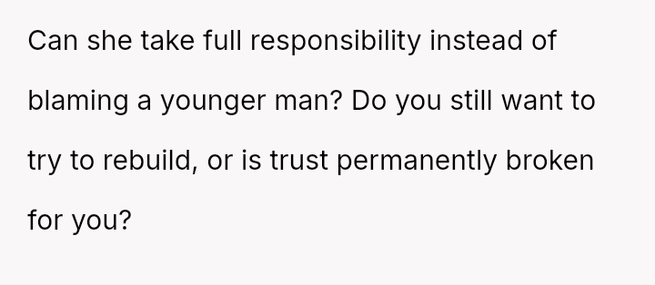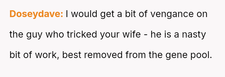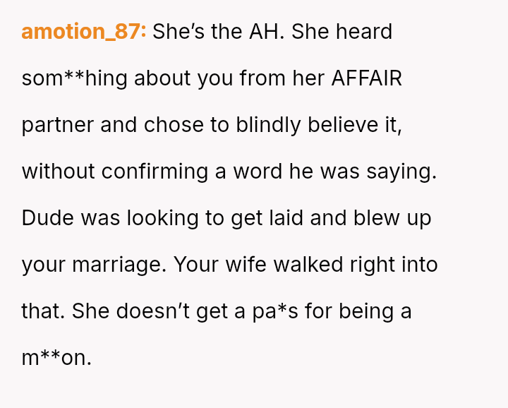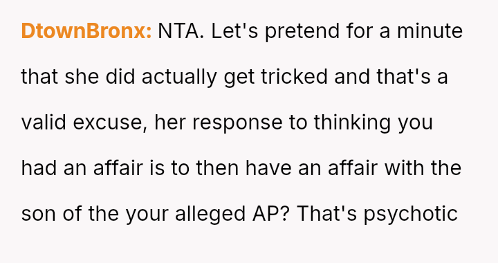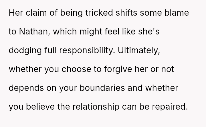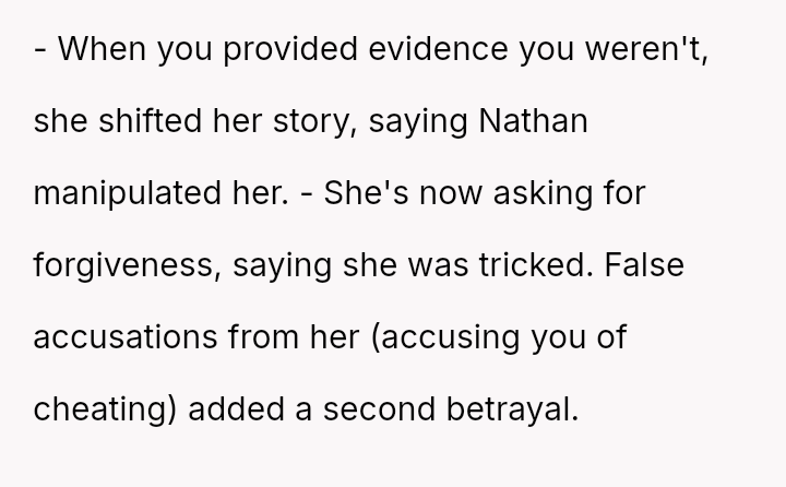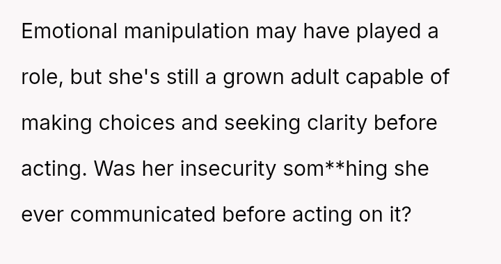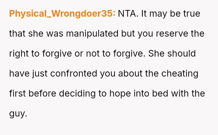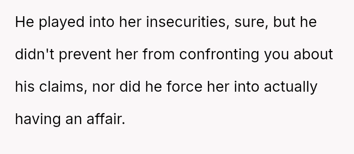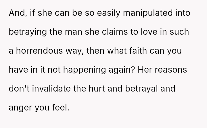Given the complex layers of mutual deceit, manipulation, and in***elity within two interconnected relationships, should the OP prioritize his need for emotional safety and truth, or is there a path toward forgiveness based on the wife's insistence that she was manipulated by a third party?