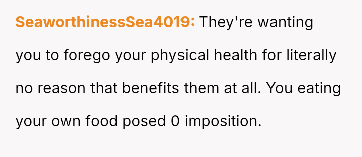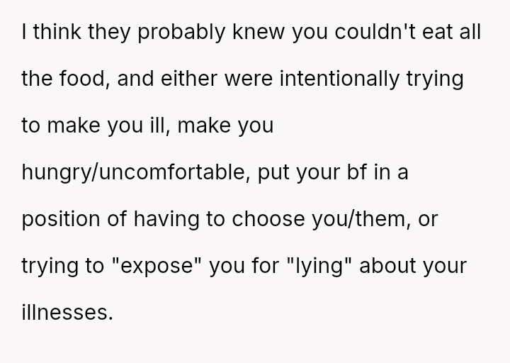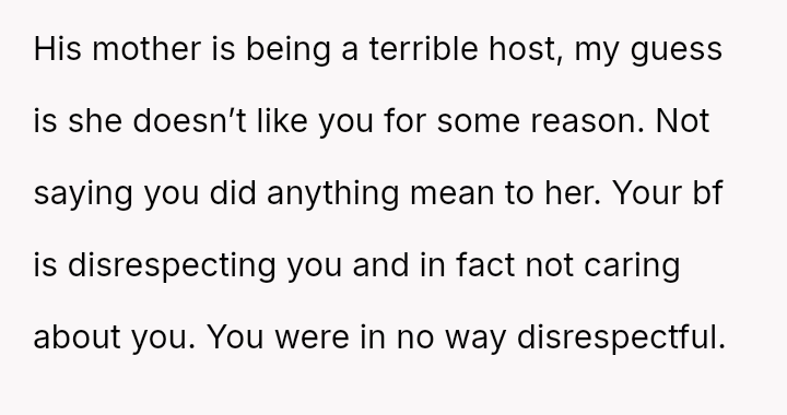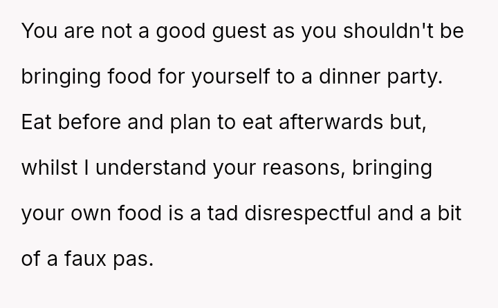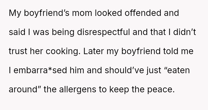 The original poster (OP) faced a difficult situation where a disclosed health necessity clashed directly with the host's expectations for hospitality, leading to feelings of disrespect from the boyfriend's mother and embarra*sment for the boyfriend.