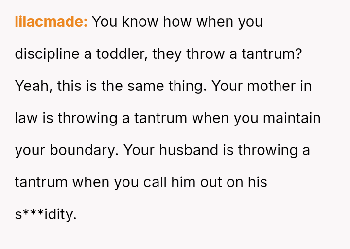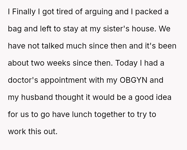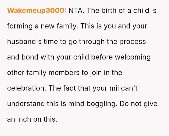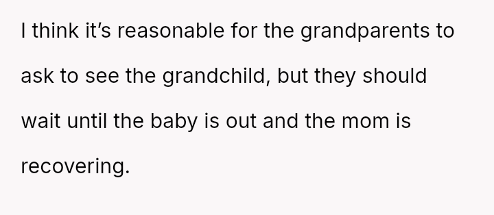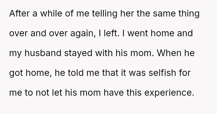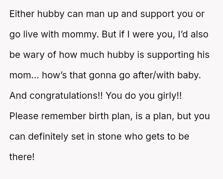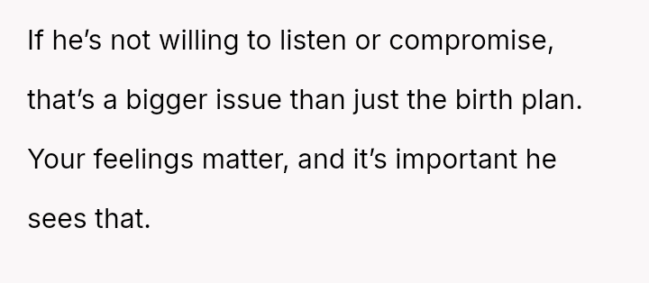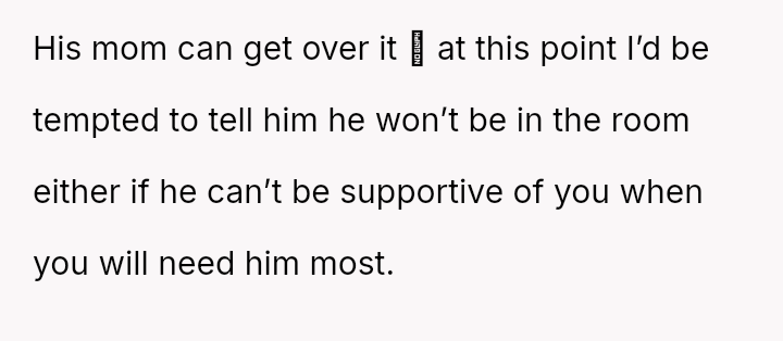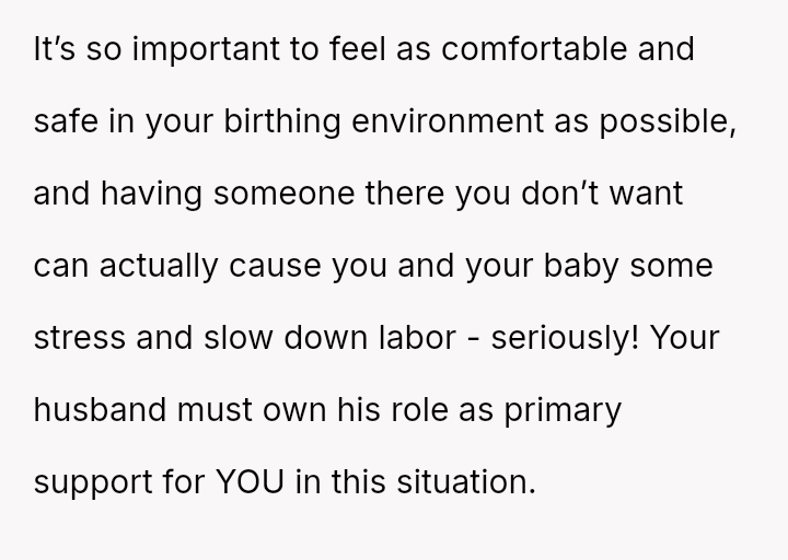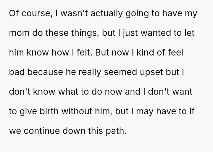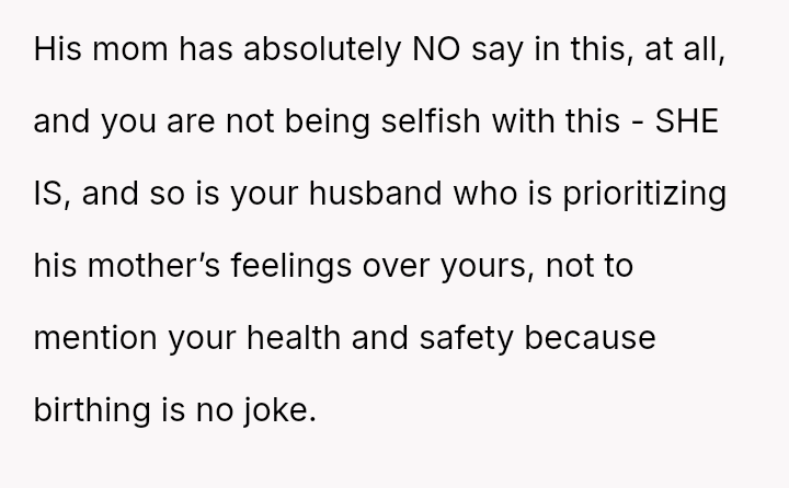 Two weeks later, the husband continues to insist the OP is being selfish by excluding his mother, leading the OP to question her marriage just before delivery.