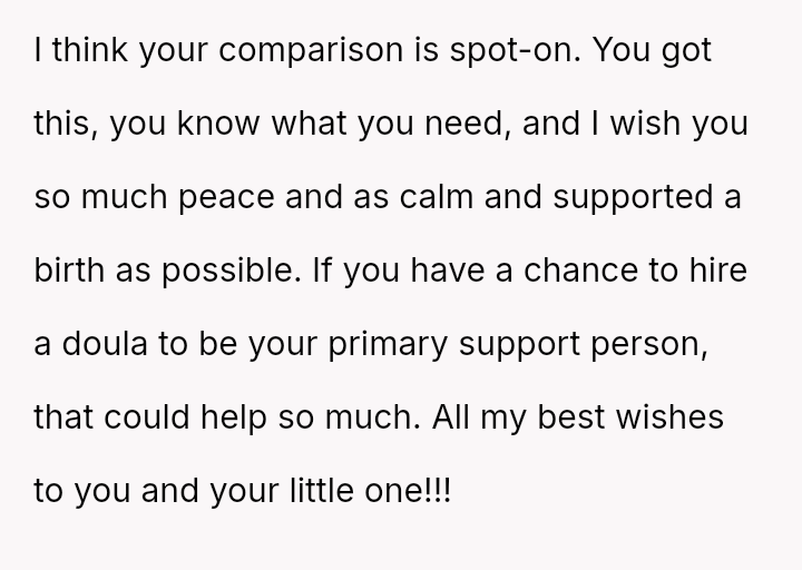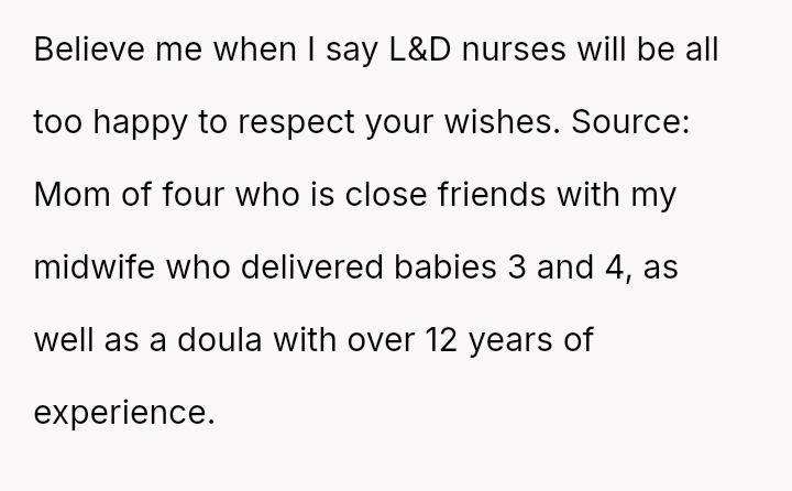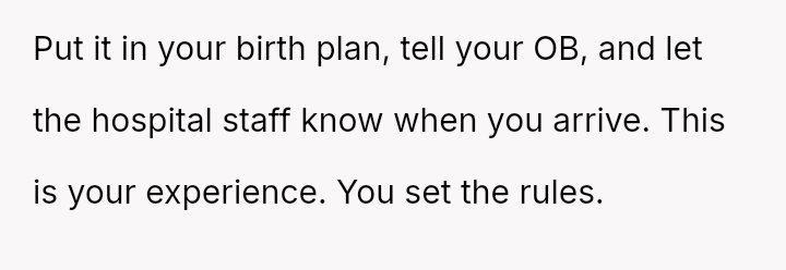 While finalizing her birth plan with her doctor, the OP discussed her wishes for a private delivery, intending for only herself and her husband to be present with the midwife.