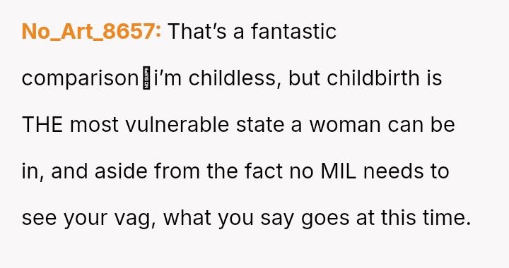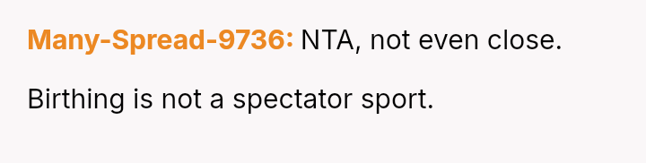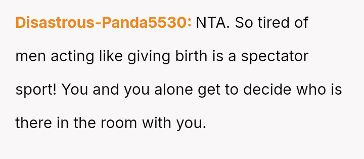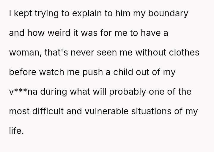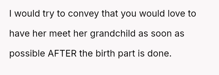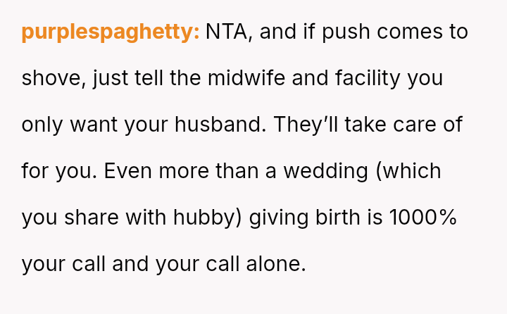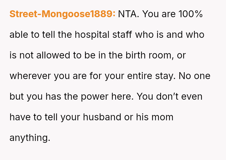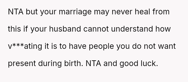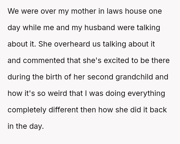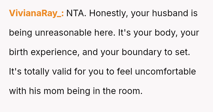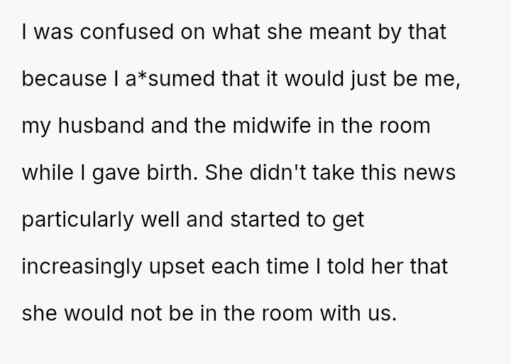 The OP's mother-in-law (MIL) overheard this discussion and became increasingly upset when told she would not be present during the birth. After repeated a*sertions of the OP's boundary, the OP left to stay with her sister.