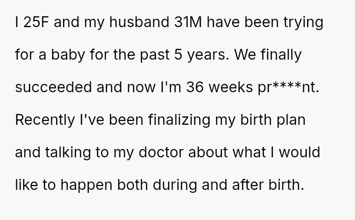 A 25-year-old woman (OP) and her 31-year-old husband have been trying to conceive for five years and are now expecting their baby at 36 weeks.