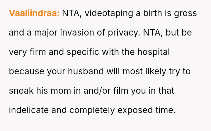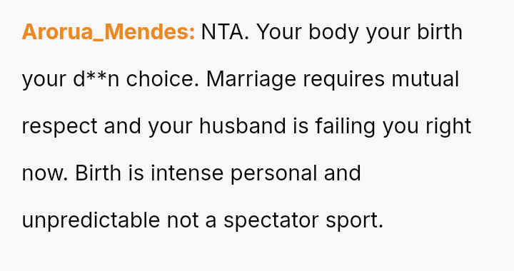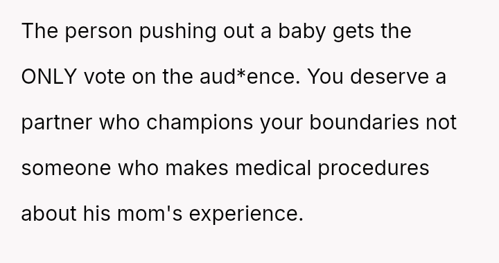 The central conflict revolves around the OP's fundamental need for privacy and control during a highly vulnerable medical event versus the strong emotional expectations and perceived ent*tlement of her husband and mother-in-law regarding participation in the birth experience.