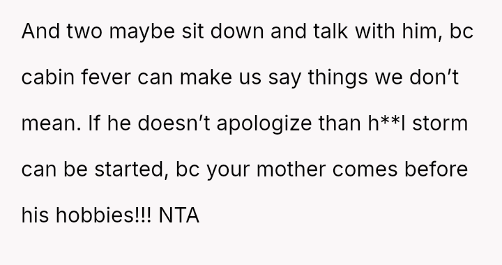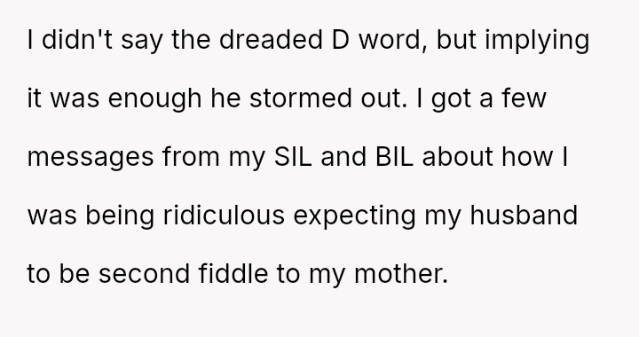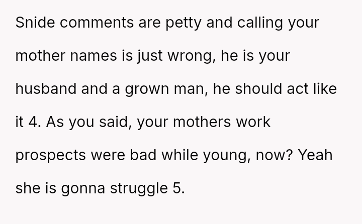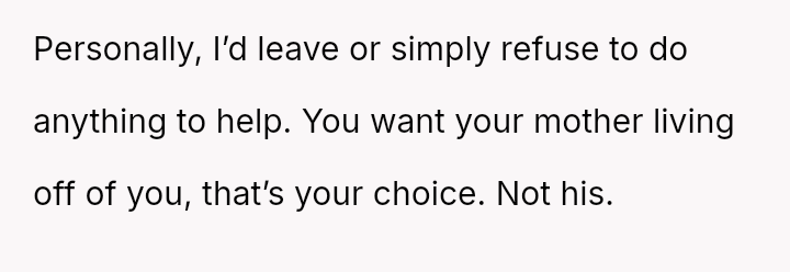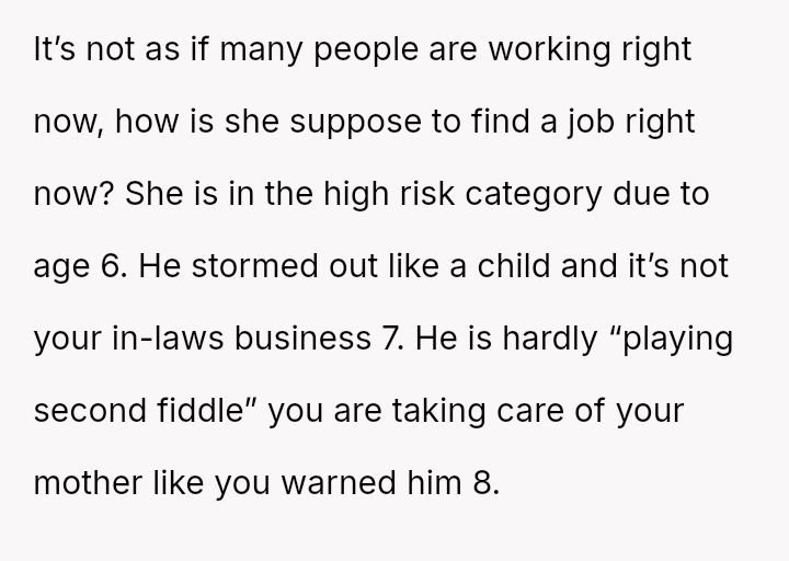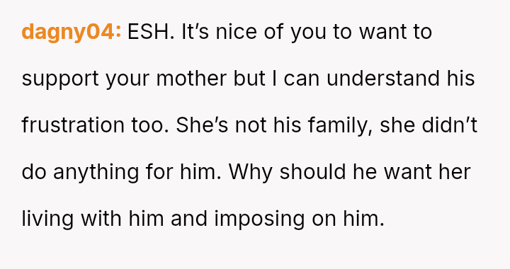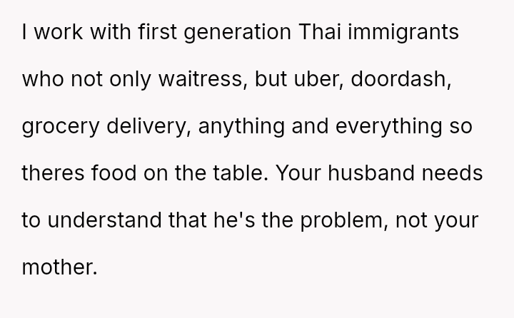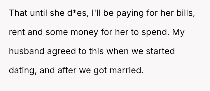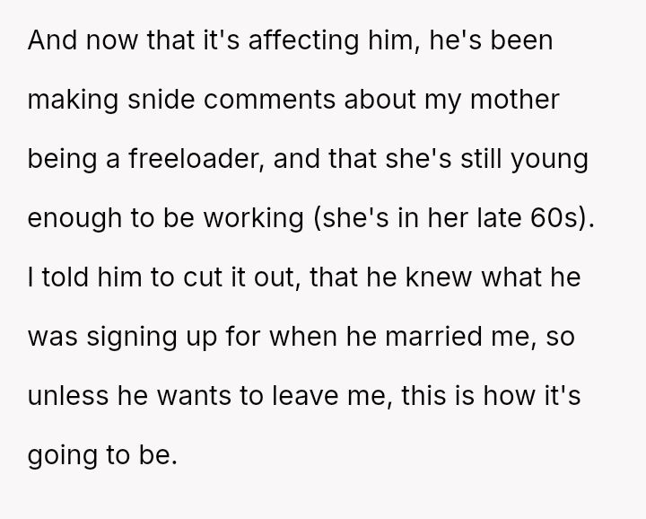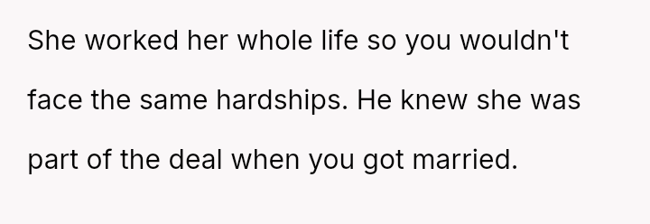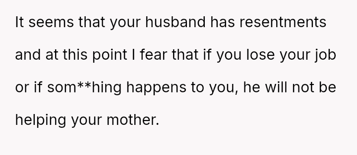 The central conflict arises because her husband, facing financial strain due to job loss, now views this long-standing commitment as an unreasonable burden that subordinates his needs to those of the mother-in-law.