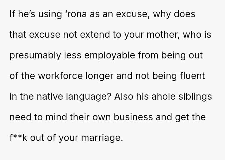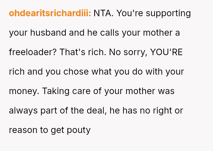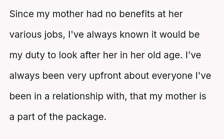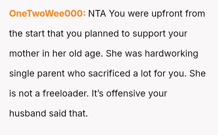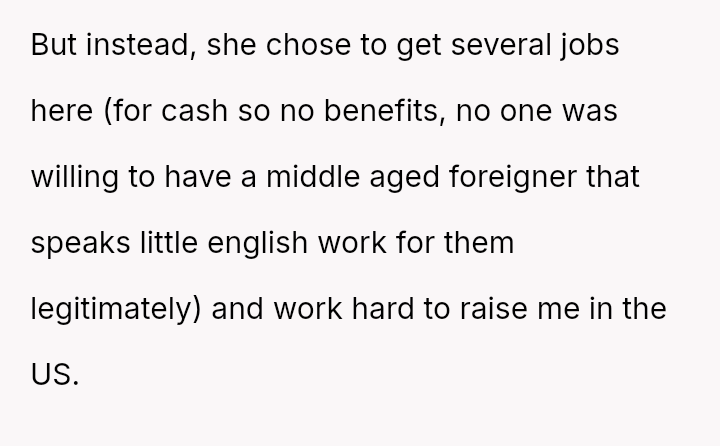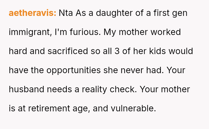 The Original Poster (OP) feels resolute in her commitment to financially support her elderly mother, viewing it as a necessary duty owed for her mother's sacrifices in raising her alone in the US.