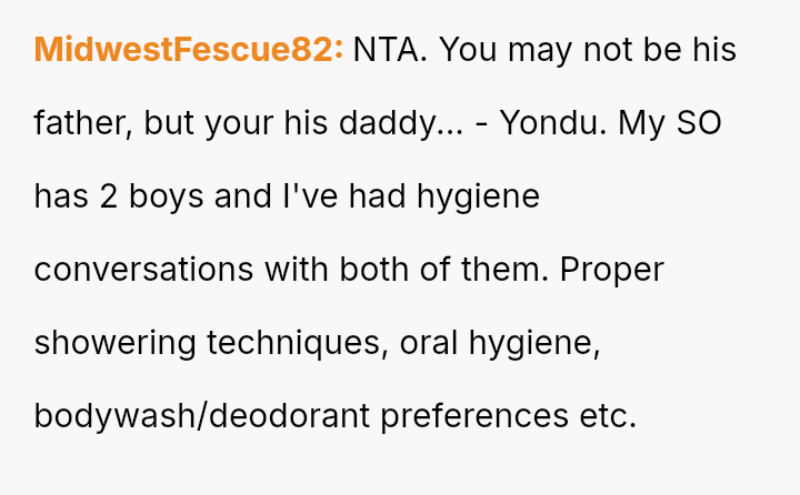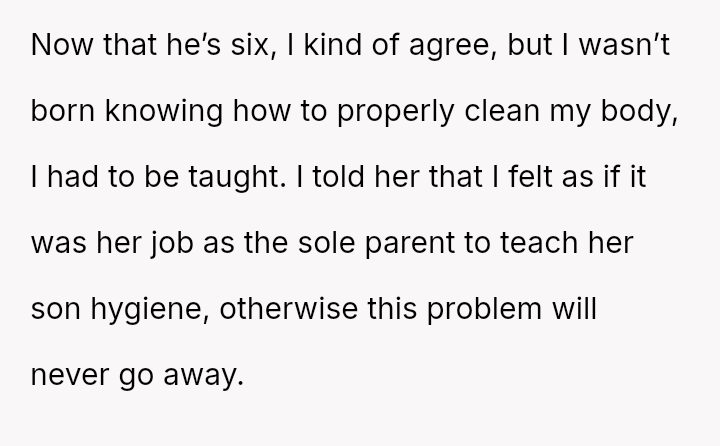 The original poster (OP) is facing a significant conflict rooted in differing views on parental responsibility and teaching hygiene to a six-year-old stepchild.