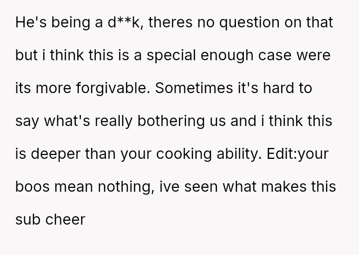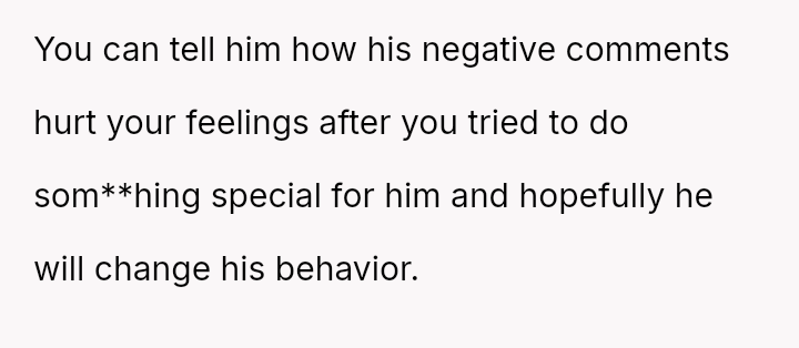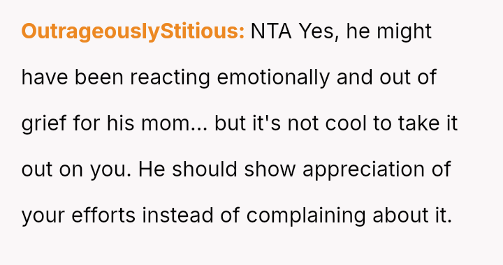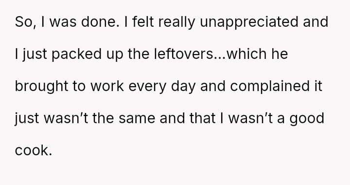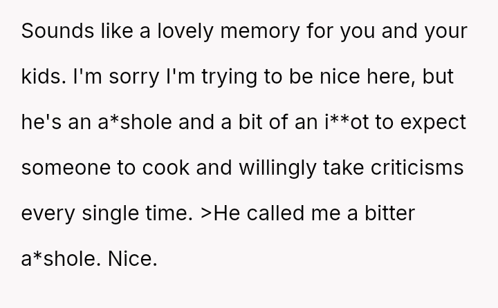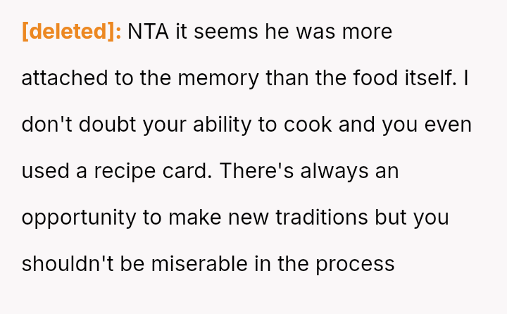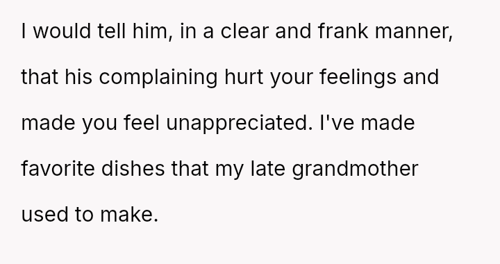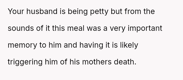 The original poster (OP) is experiencing significant emotional distress due to feeling unappreciated and criticized after putting effort into recreating a meaningful family meal for her husband.