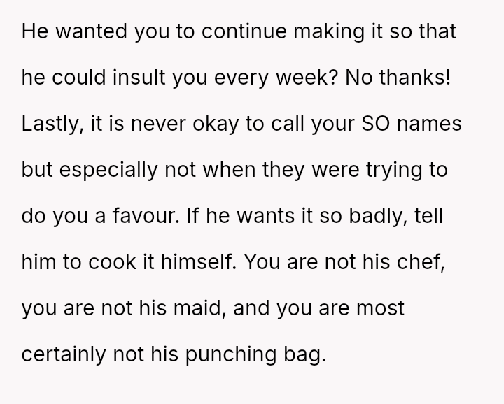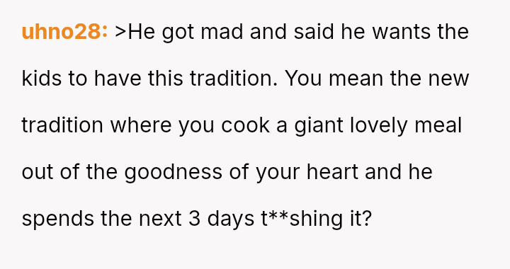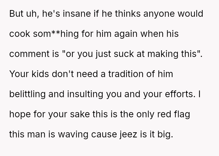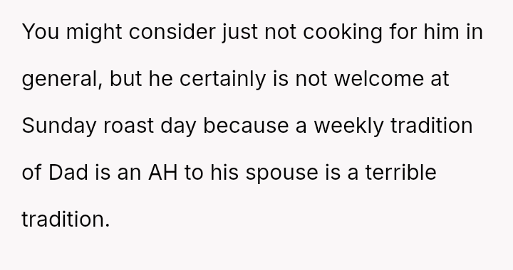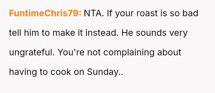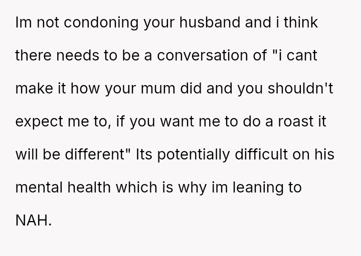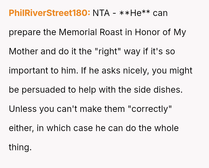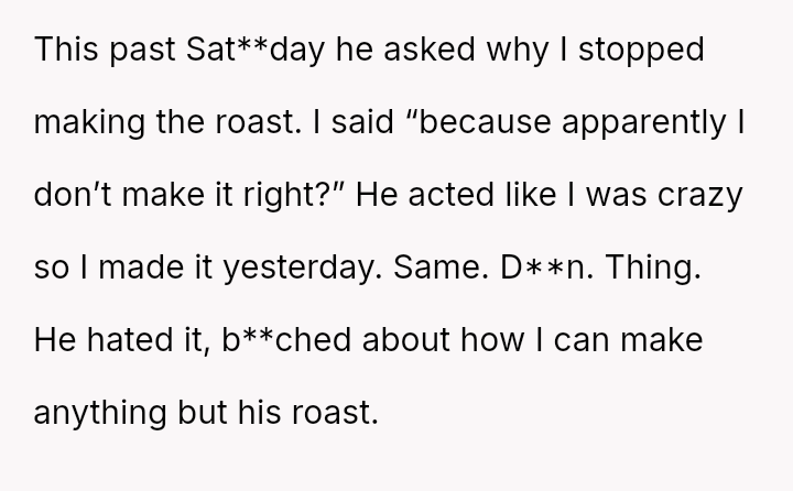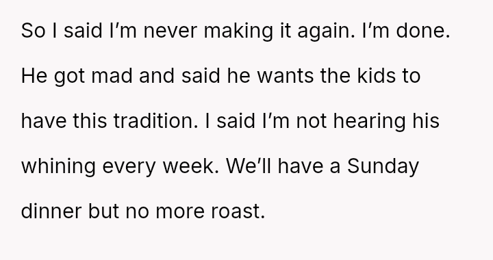 Is the OP justified in refusing to cook the roast out of self-respect when her efforts are met with constant, harsh criticism, or is she obligated to continue the tradition for her children's sake, even if it means enduring her husband's negative comments about her cooking?